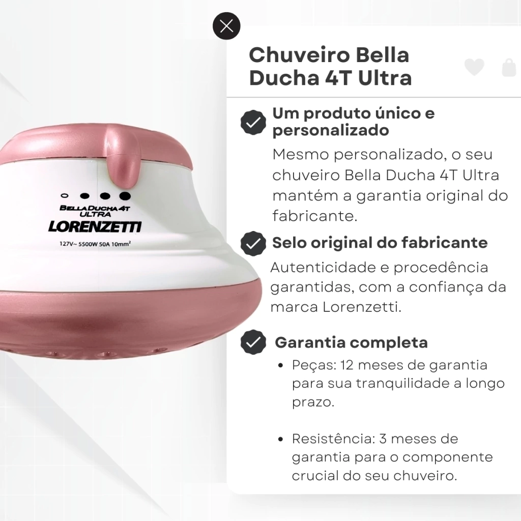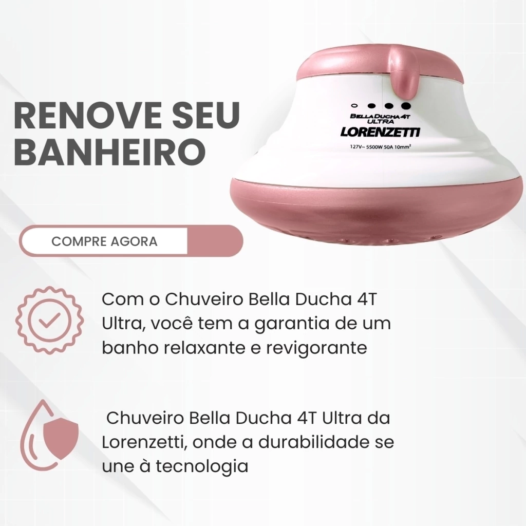 Renove o seu banho com a combinação perfeita entre design sofisticado e desempenho de alto nível. O Chuveiro Lorenzetti Bella Ducha 4T Ultra Rose Gold traz potência de 6800W, tensão de 220V e um acabamento Rose Gold elegante que valoriza qualquer ambiente. Ideal para quem busca conforto térmico e um toque de luxo no banheiro.