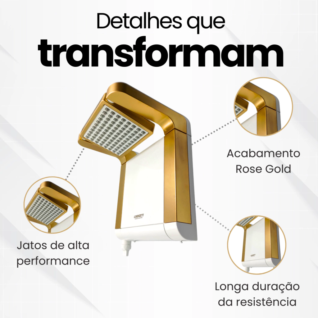 Design Dourado Sofisticado: A cor dourada confere um visual sofisticado e luxuoso ao banheiro, tornando o chuveiro não apenas funcional, mas também um elemento de decoração.
