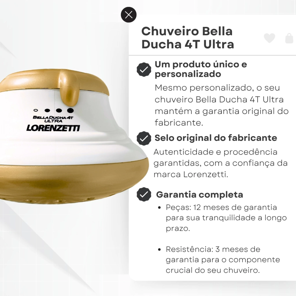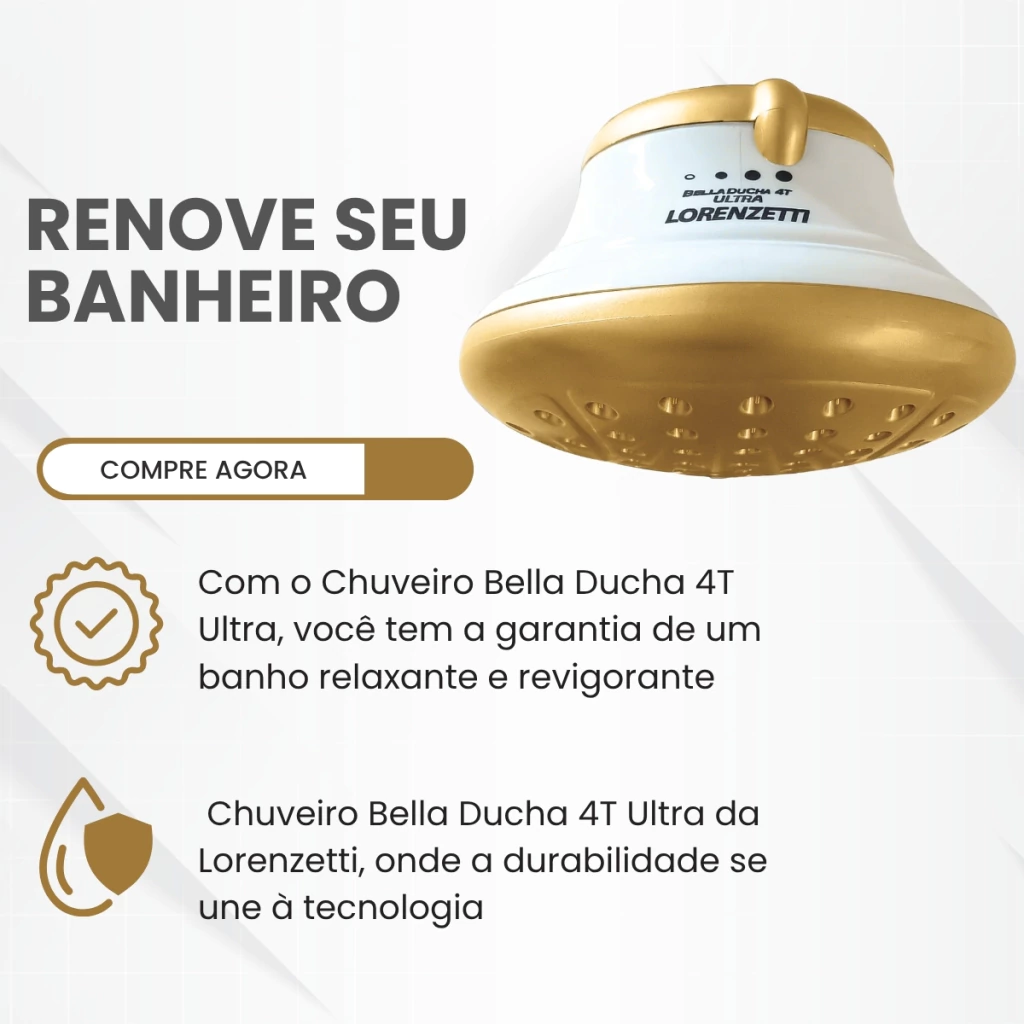Renove o seu banho com a combinação perfeita entre design sofisticado e desempenho de alto nível. O Chuveiro Lorenzetti Bella Ducha 4T Ultra Dourado traz potência de 6800W, tensão de 220V e um acabamento dourado elegante que valoriza qualquer ambiente. Ideal para quem busca conforto térmico e um toque de luxo no banheiro.