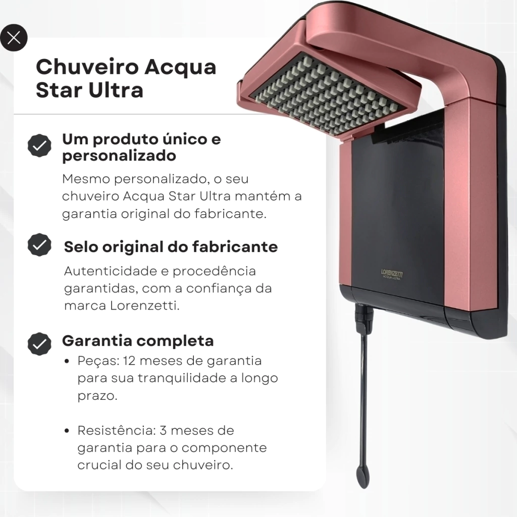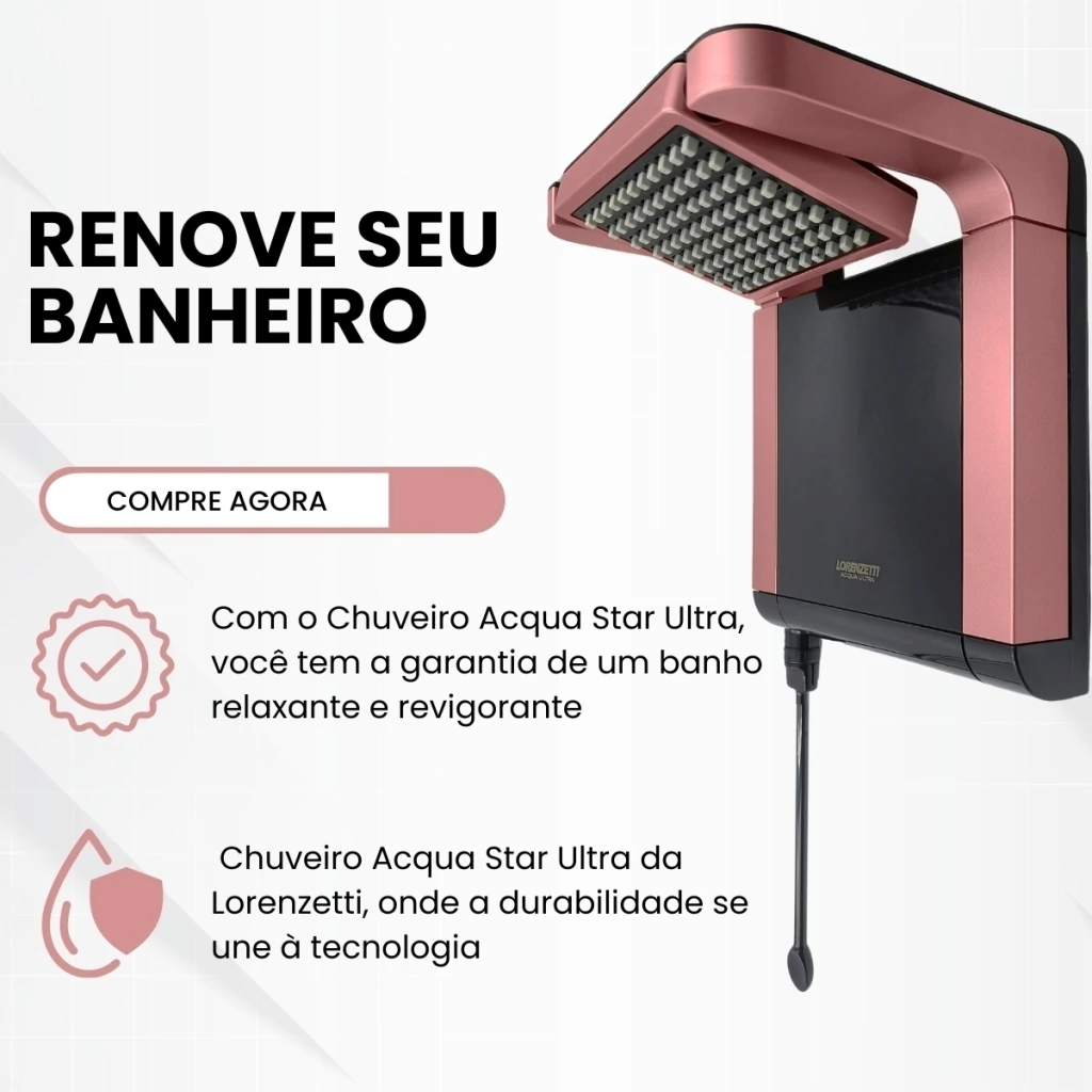 O Chuveiro Lorenzetti Aqua Star 220V 7800W combina design sofisticado com tecnologia de ponta, garantindo um banho confortável e eficiente mesmo em locais com baixa pressão de água. Seu acabamento preto com detalhes Rose Gold traz elegância para qualquer banheiro.