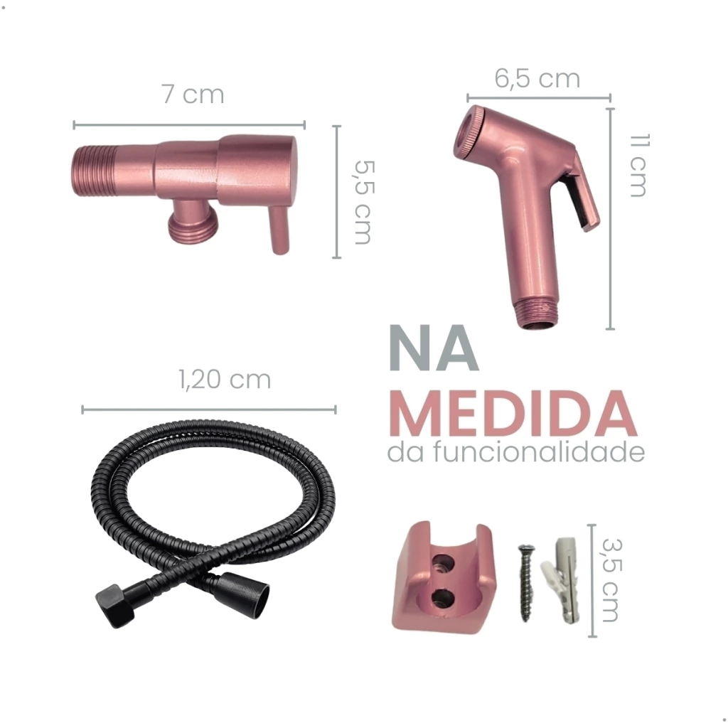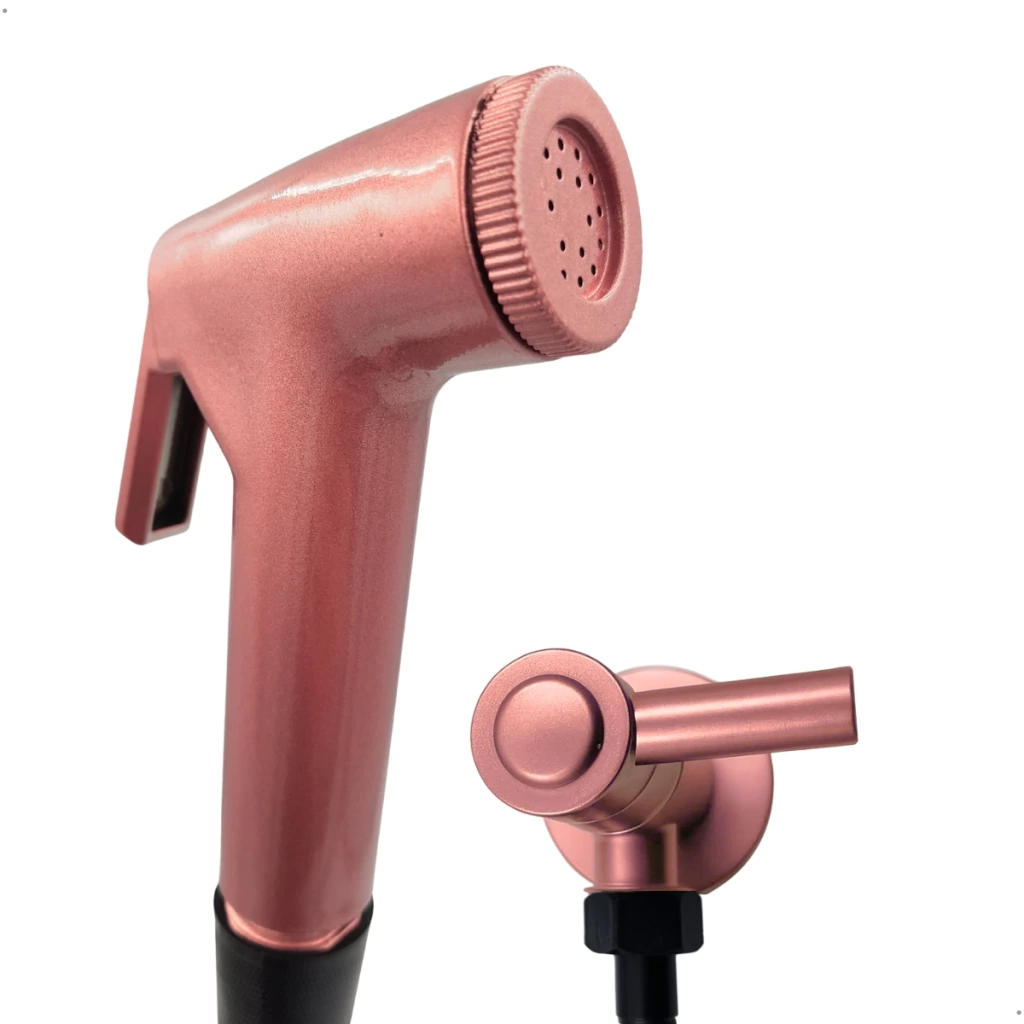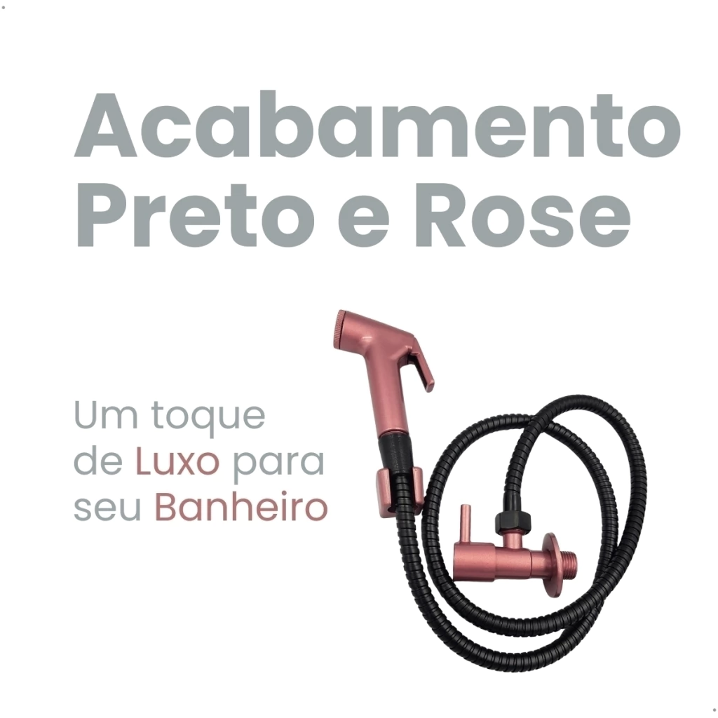 Garanta praticidade e sofisticação no seu banheiro com este Kit Ducha Higiênica Rose Gold. Composto por gatilho redondo em ABS resistente, registro 1/4 de volta para controle preciso da água, suporte de parede combinando e engate flexível de 120 cm em aço inox na cor preta. Ideal para quem busca funcionalidade com um toque moderno e elegante, o conjunto é compatível com instalações padrão e fácil de instalar.