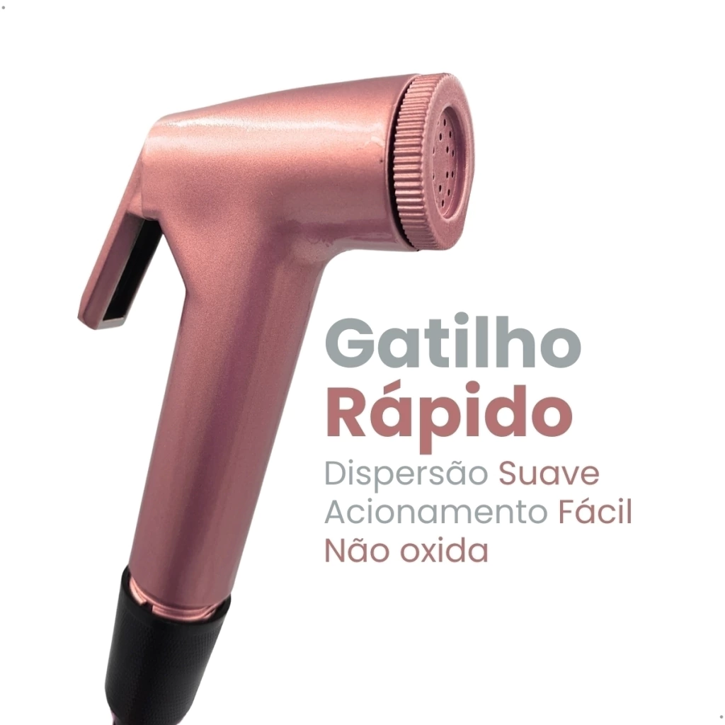 Material do gatilho: ABSAcabamento do gatilho: Rose GoldRegistro: 1/4 de volta com acabamento rose goldEngate flexível: 120 cm, aço inox, cor pretaSuporte: ABS com acabamento rose goldInstalação: ParedeCompatibilidade: Padrão 1/2"Uso: Banheiros, lavabosPressão recomendada: 5 a 40 mca