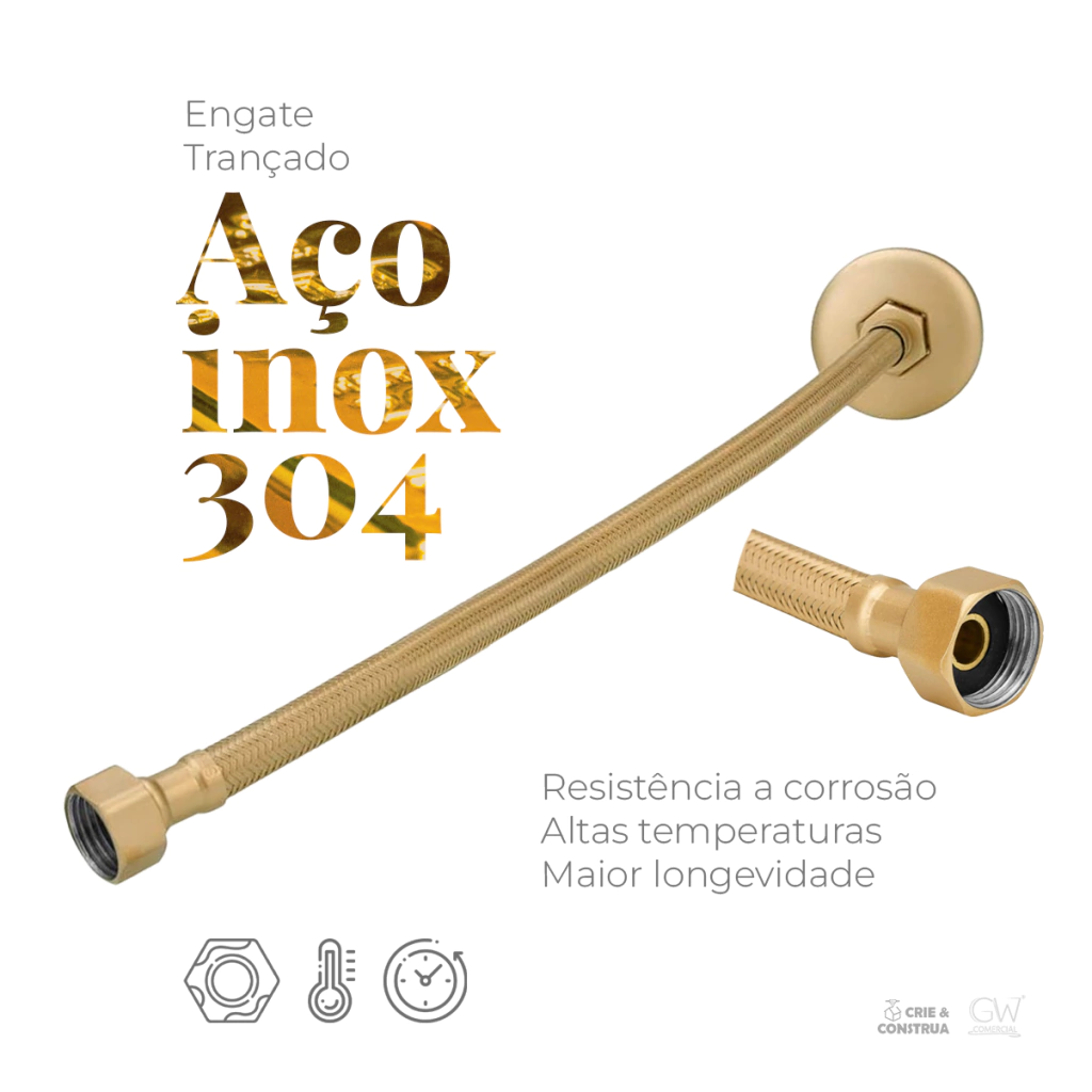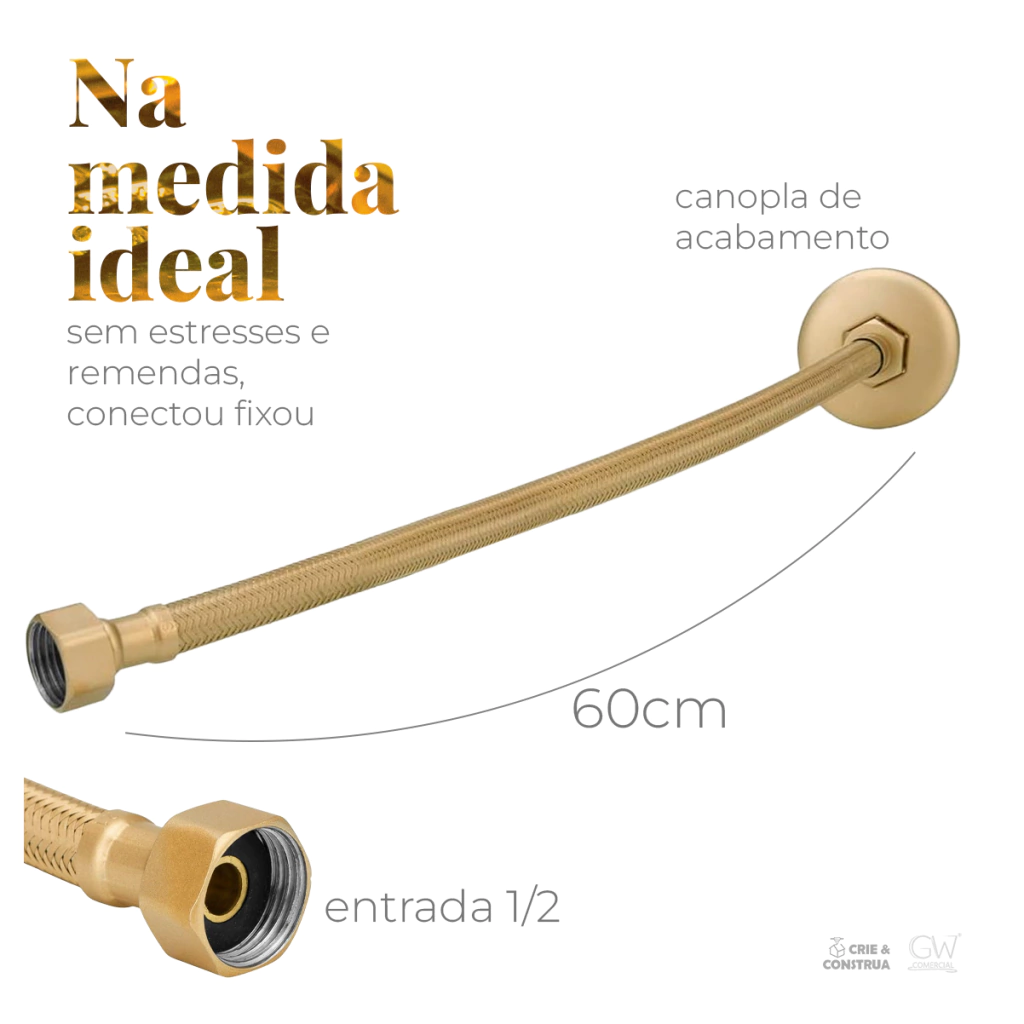 Comprimento: 60 cmTipo: Engate flexível trançadoMaterial: Aço inoxidável e latãoAcabamento: Dourado acetinadoConexões: 1/2" com niple presoAplicação: Água fria e quenteUso: Lavatórios, pias, tanques e vasos sanitários