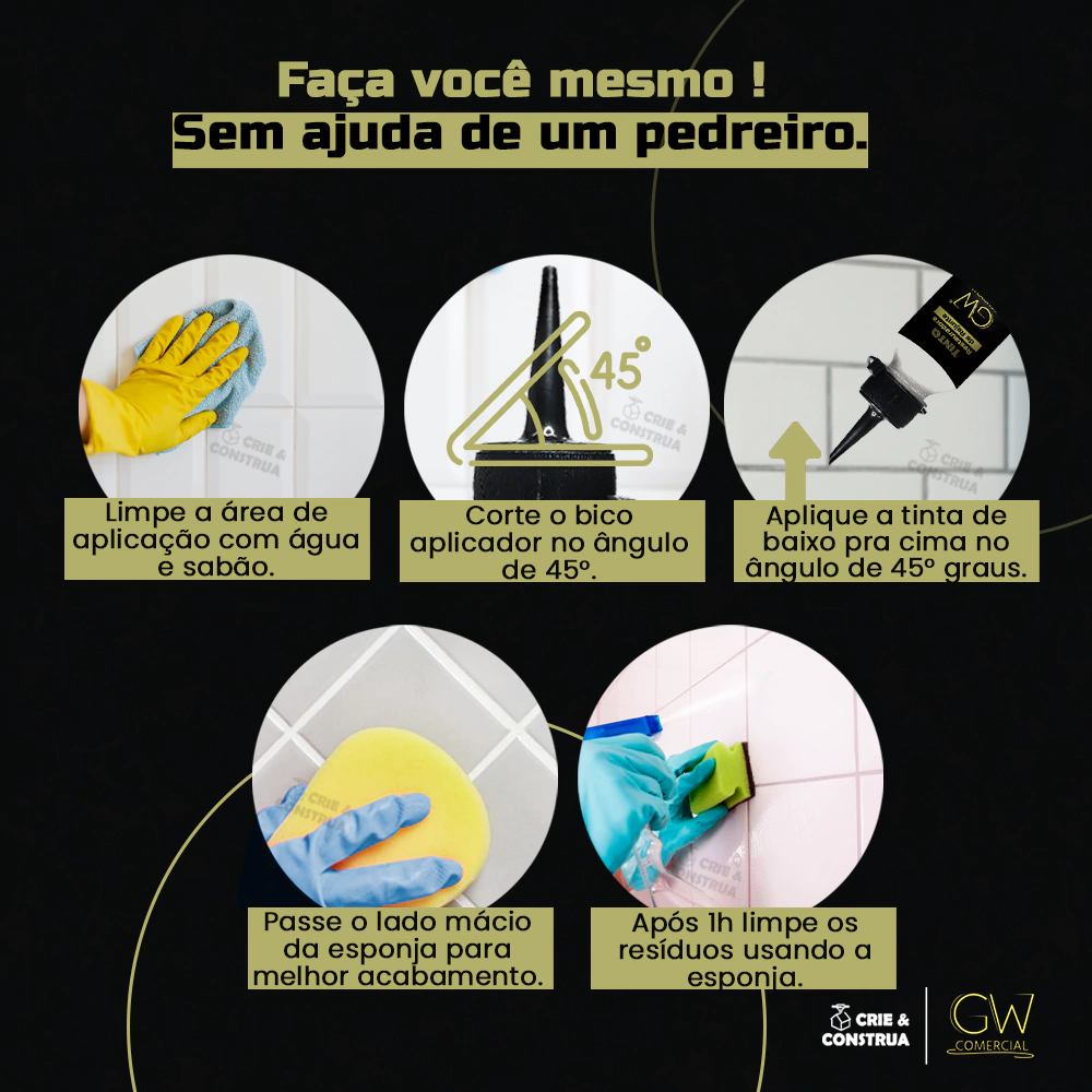 - Piscinas: 24 horas antes da aplicação do produto, lave a superfície com uma solução de água, sabão e água sanitária. Escove, enxágue e aguarde a secagem. - Falhas no rejuntamento antigo deverão ser preenchidas.