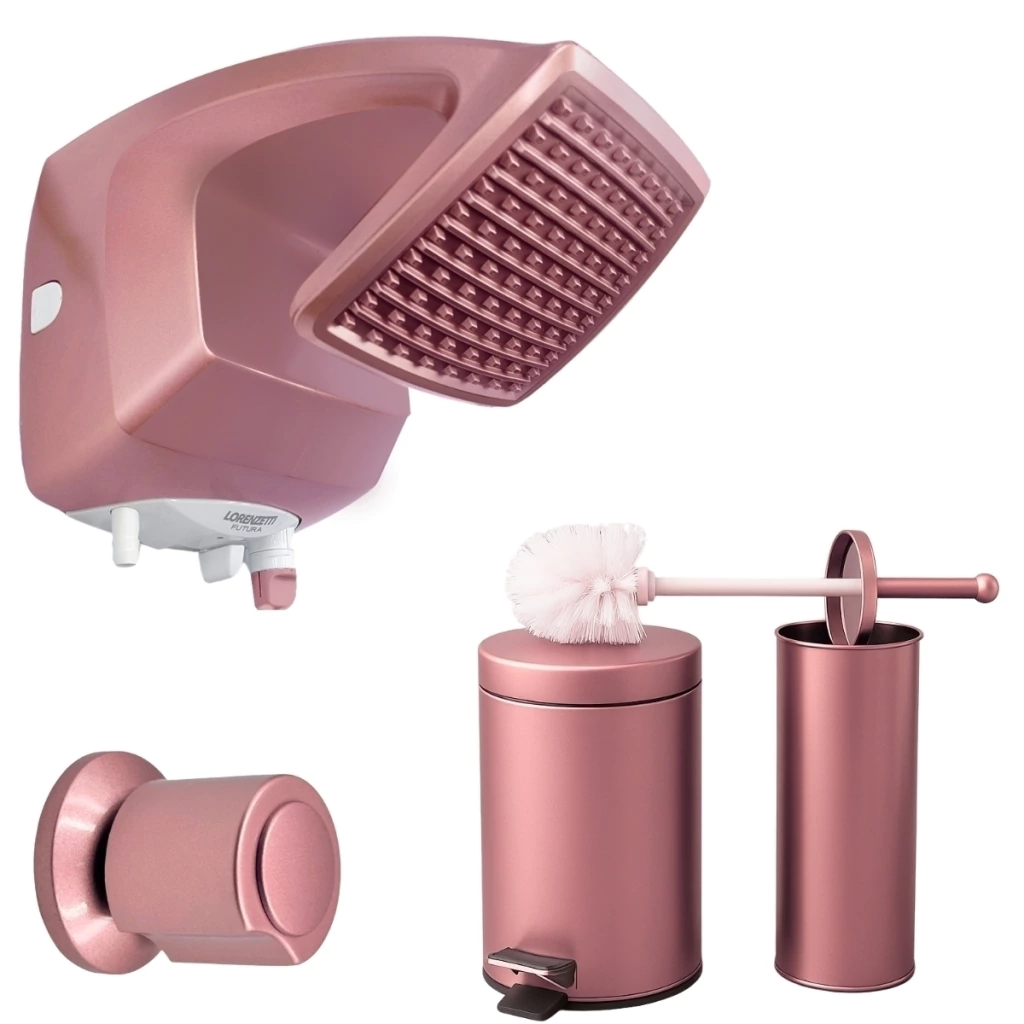 Transforme seu banheiro com este kit completo em rose gold, unindo funcionalidade, economia e sofisticação.