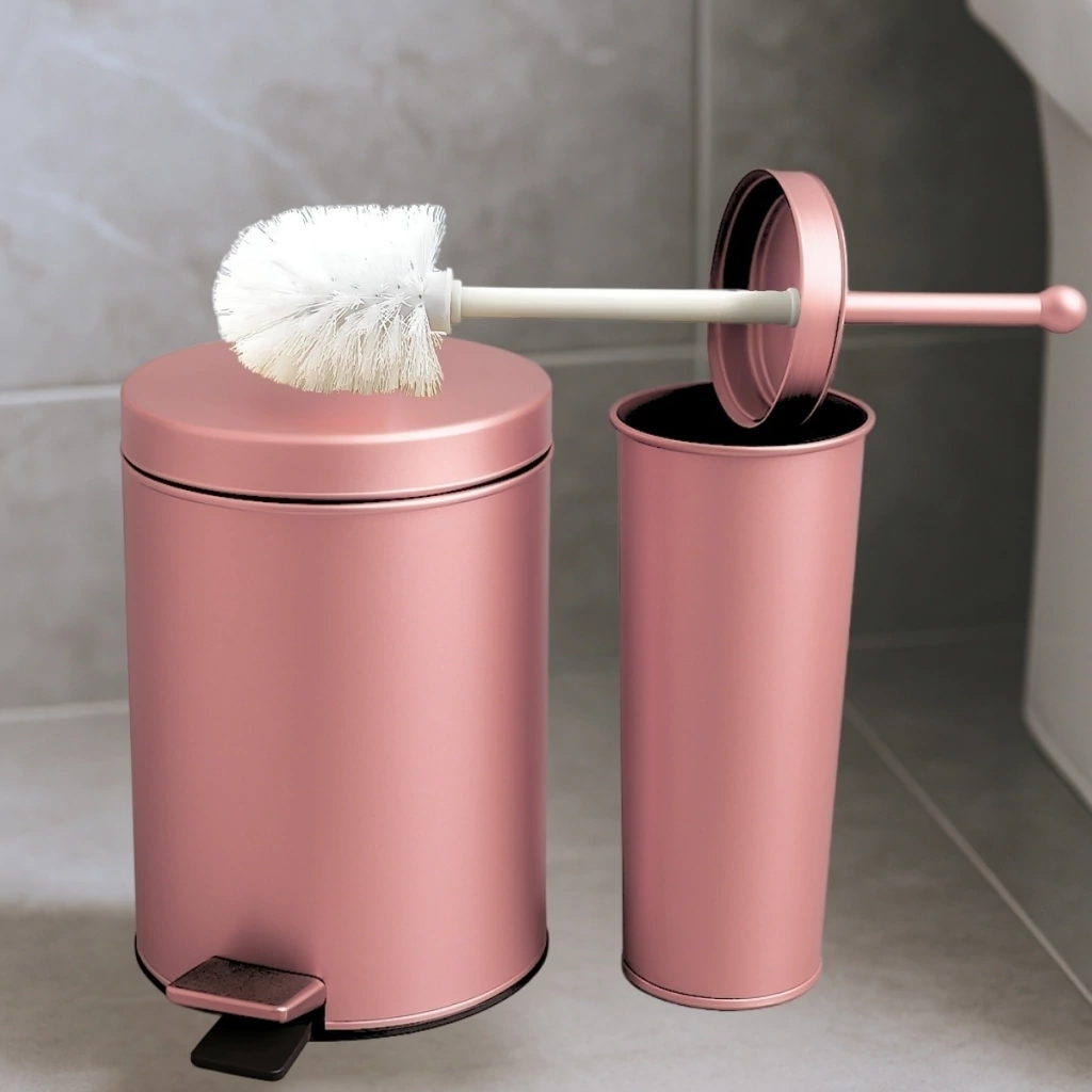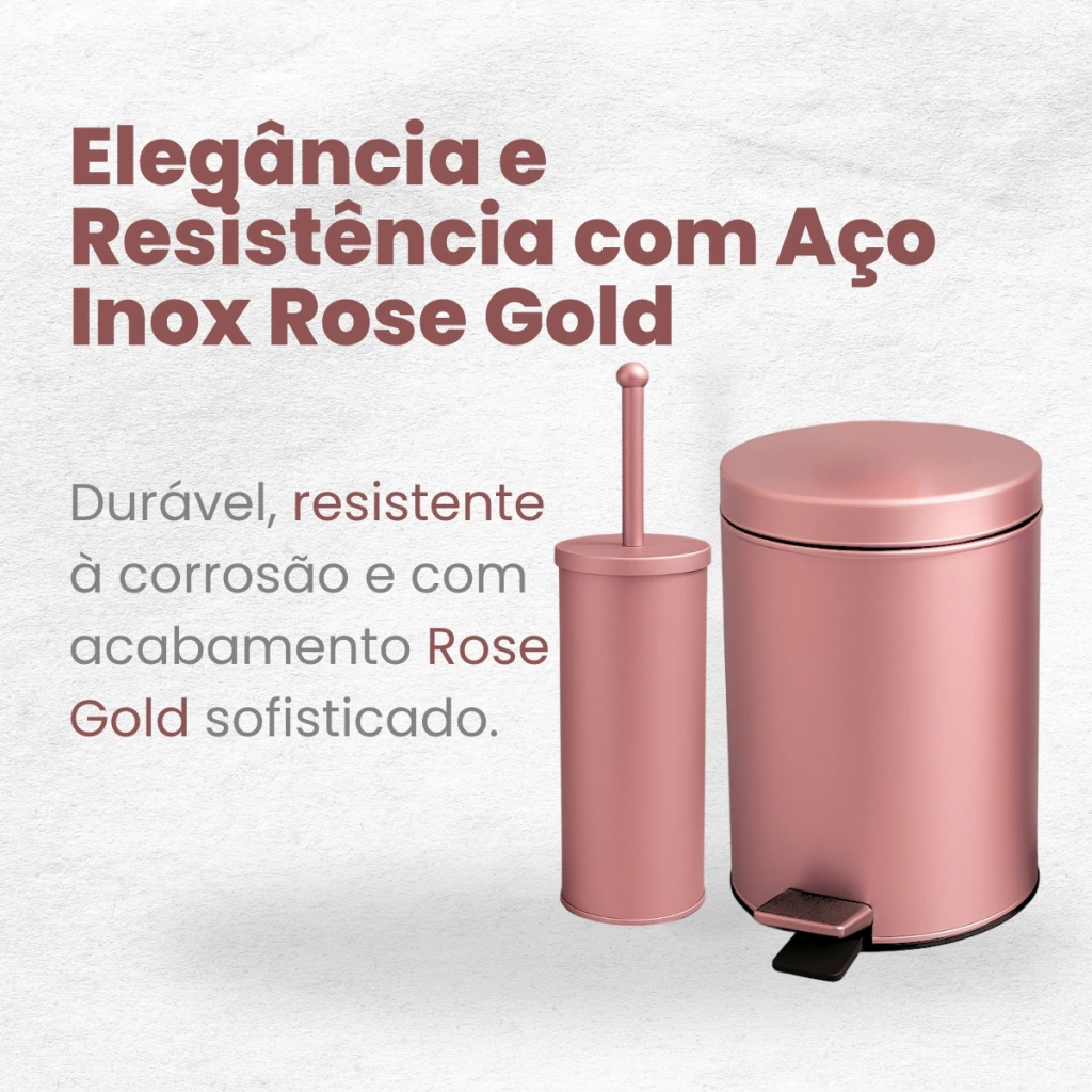 Adicione sofisticação e praticidade ao seu banheiro com este Kit com Lixeira de Pedal 3L e Escova Sanitária com Suporte. O acabamento rose gold elegante em aço inox traz modernidade ao ambiente, enquanto os componentes removíveis facilitam a limpeza do dia a dia. Ideal para banheiros compactos e lavabos, combina design funcional e durabilidade.