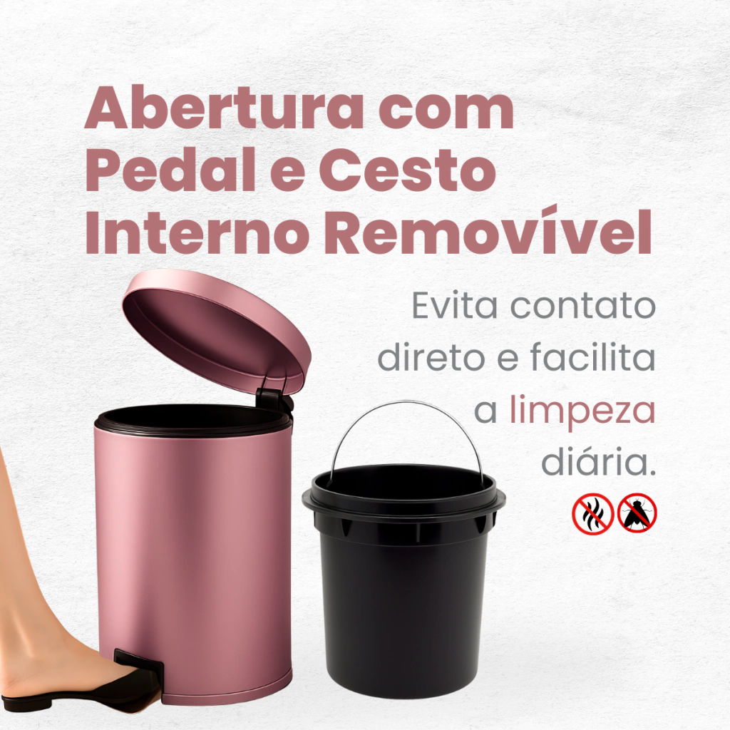 Com acabamento fosco sofisticado, traz charme para banheiros, cozinhas ou lavabos. Conta com pedal para abertura prática e higiênica, além de cesto interno removível com alça para facilitar a limpeza e troca de sacos. Compacta, mas com capacidade ideal para uso diário, seu design combina com ambientes modernos e elegantes.