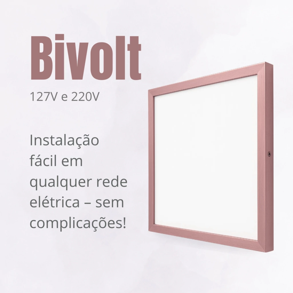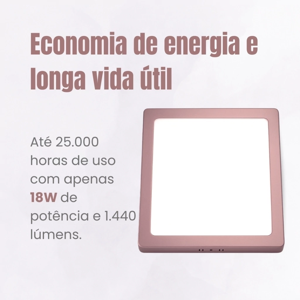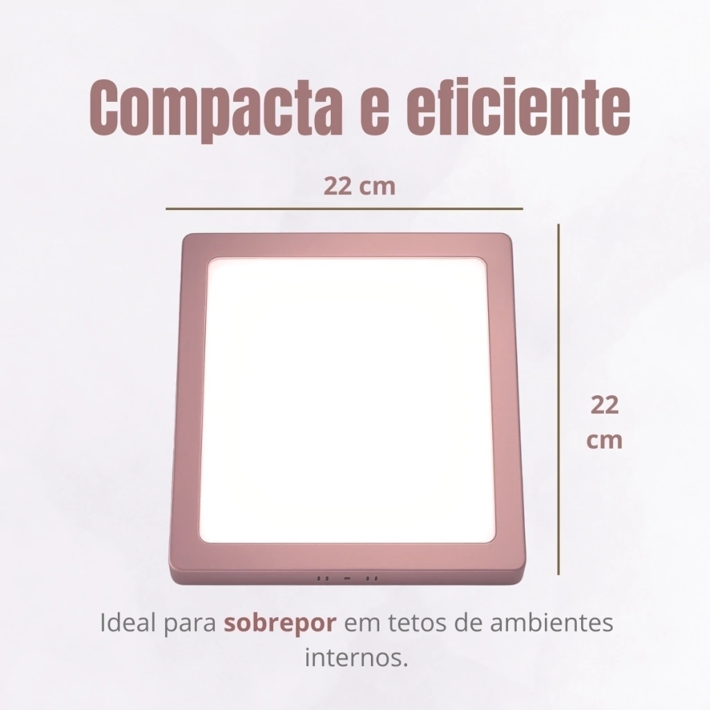 Modelo: Luminária LED Quadrada de Sobrepor Formato: Quadrado Potência: 18W Temperatura de Cor: 6500K (luz branca fria) Fluxo Luminoso: Aproximadamente 1.440 lúmens Tensão: Bivolt (110V – 220V) Frequência: 50/60Hz Acabamento: Rose Gold Tipo de Instalação: Sobrepor no teto Dimensões: 22 cm x 22 cm x 3,5 cm (aprox.) Vida Útil: Até 25.000 horas