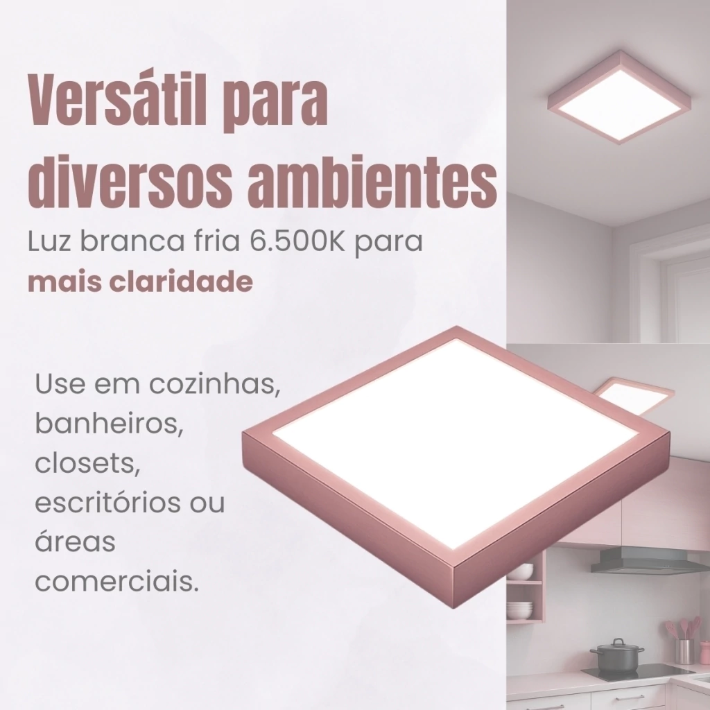 A Luminária LED Quadrada de Sobrepor 18W 6500K Rose Gold é a escolha ideal para quem busca modernidade, eficiência energética e um toque de sofisticação. Com acabamento rose gold e luz branca fria (6500K), essa luminária transforma ambientes residenciais e comerciais, proporcionando uma iluminação clara, uniforme e elegante. Indicada para salas, cozinhas, banheiros, escritórios e corredores, ela alia alto desempenho com baixo consumo de energia, além de ser fácil de instalar diretamente no teto.