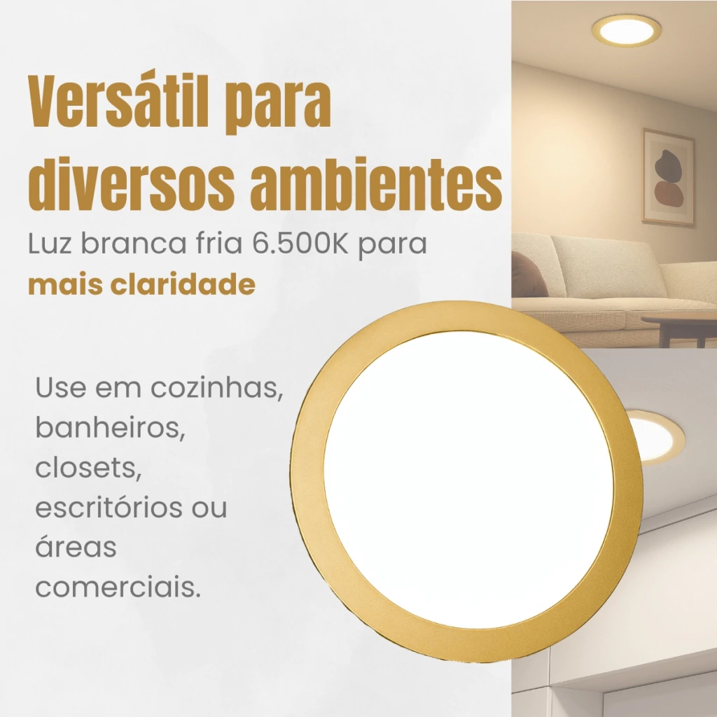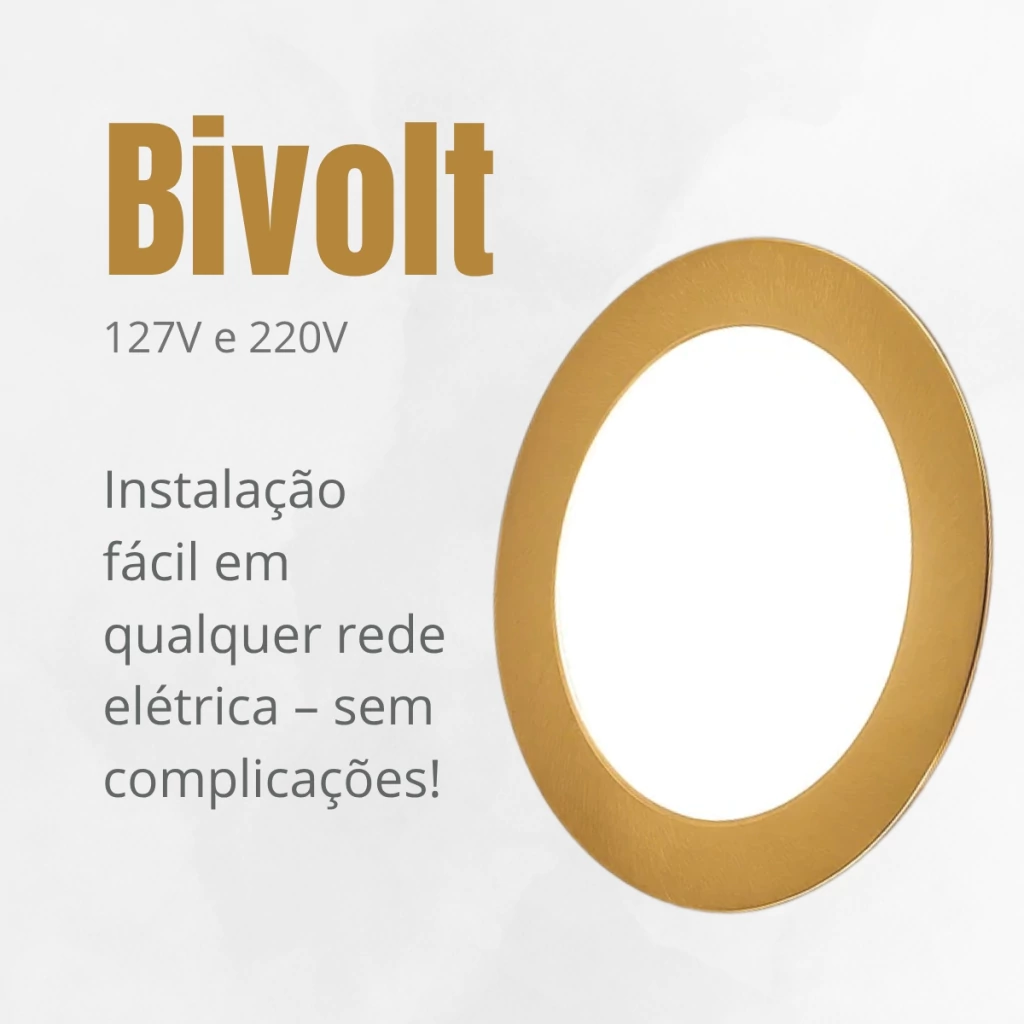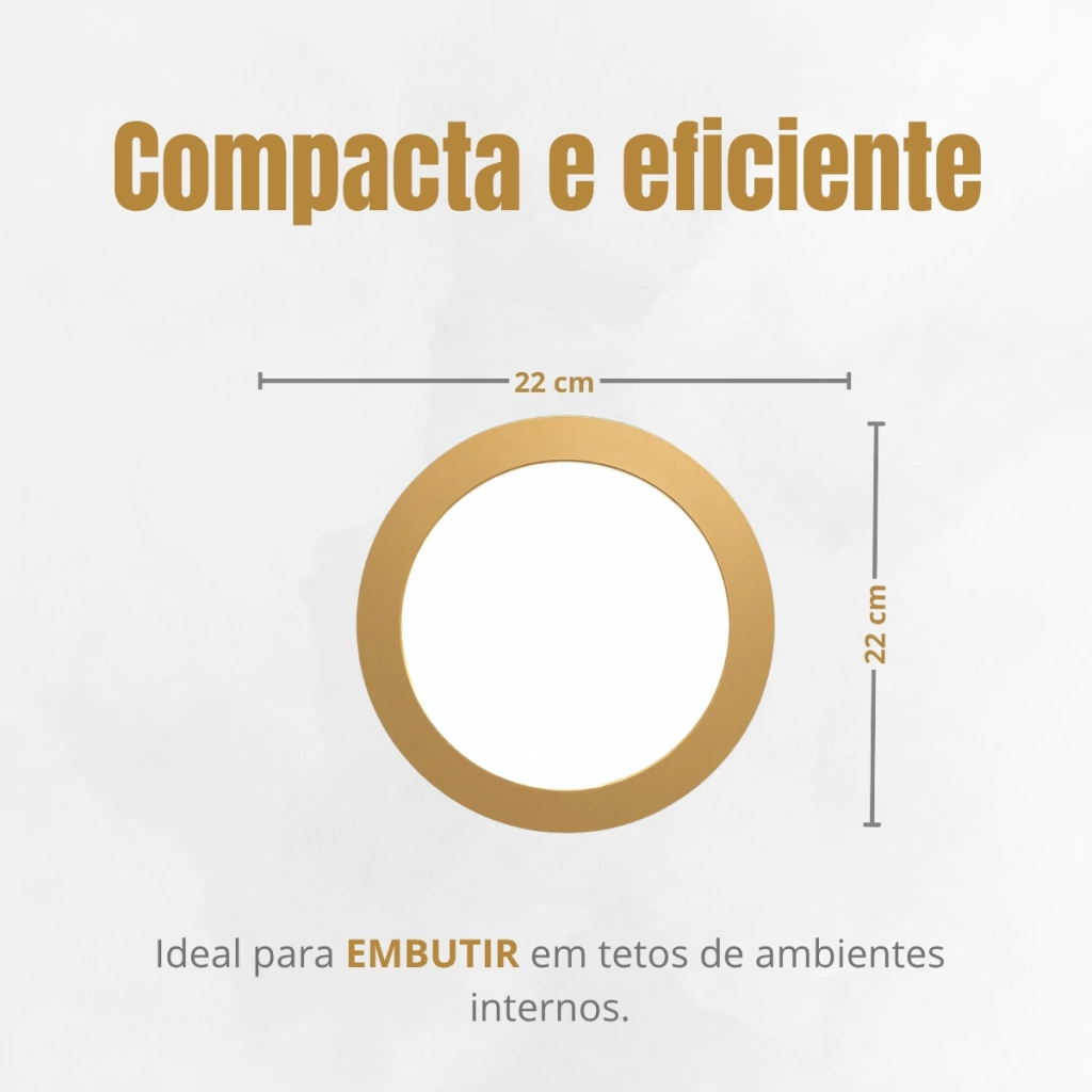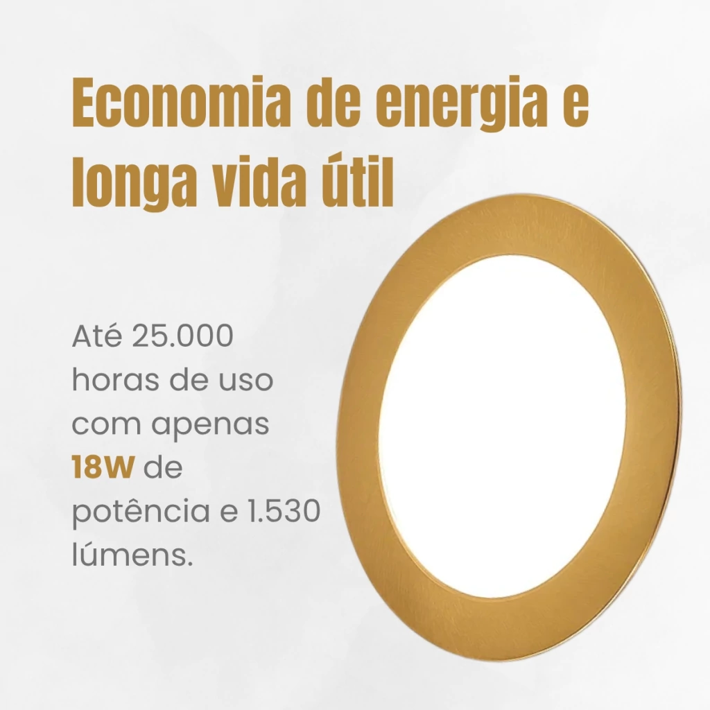 A Luminária Painel LED Redonda de Embutir 18W com acabamento dourado oferece sofisticação e eficiência em um só produto. Com tonalidade branca fria (6500K), ilumina com intensidade e economia, garantindo até 15.000 horas de vida útil. Seu design moderno com borda dourada valoriza a decoração de ambientes residenciais, comerciais e corporativos, trazendo estilo e funcionalidade.