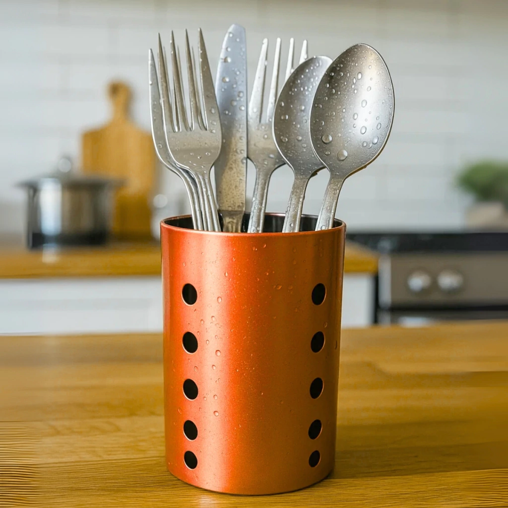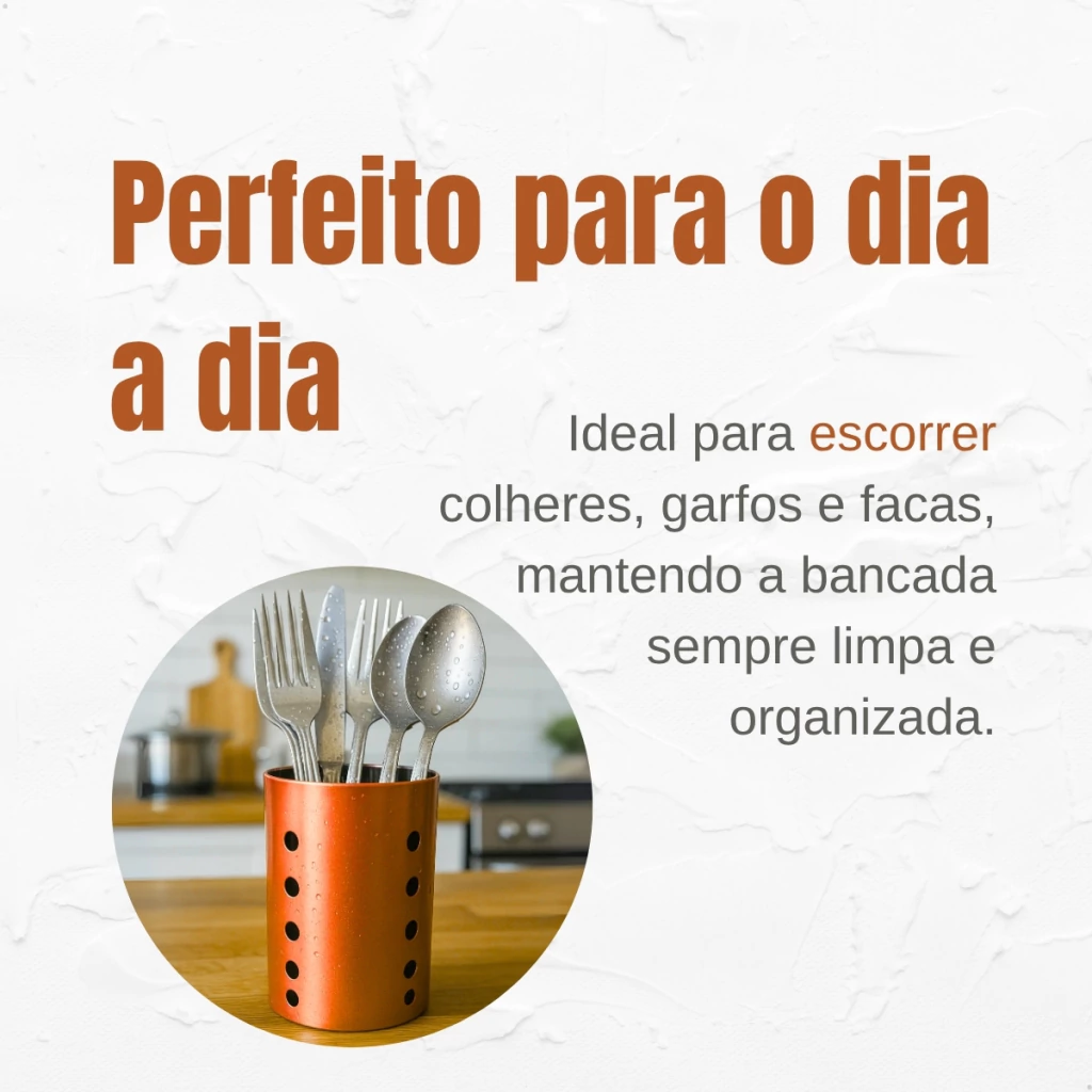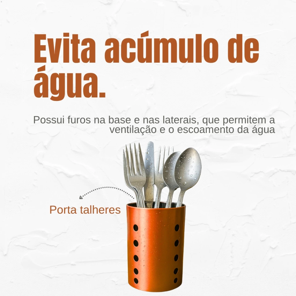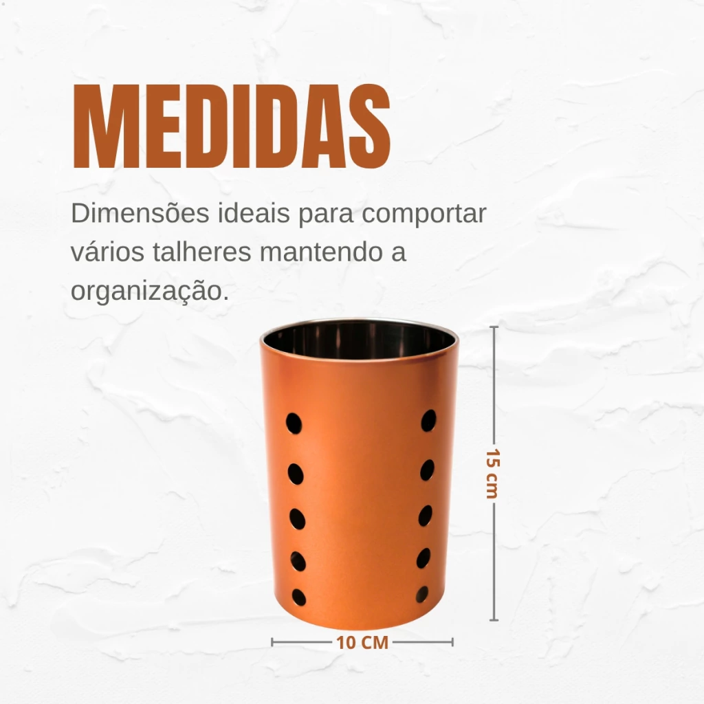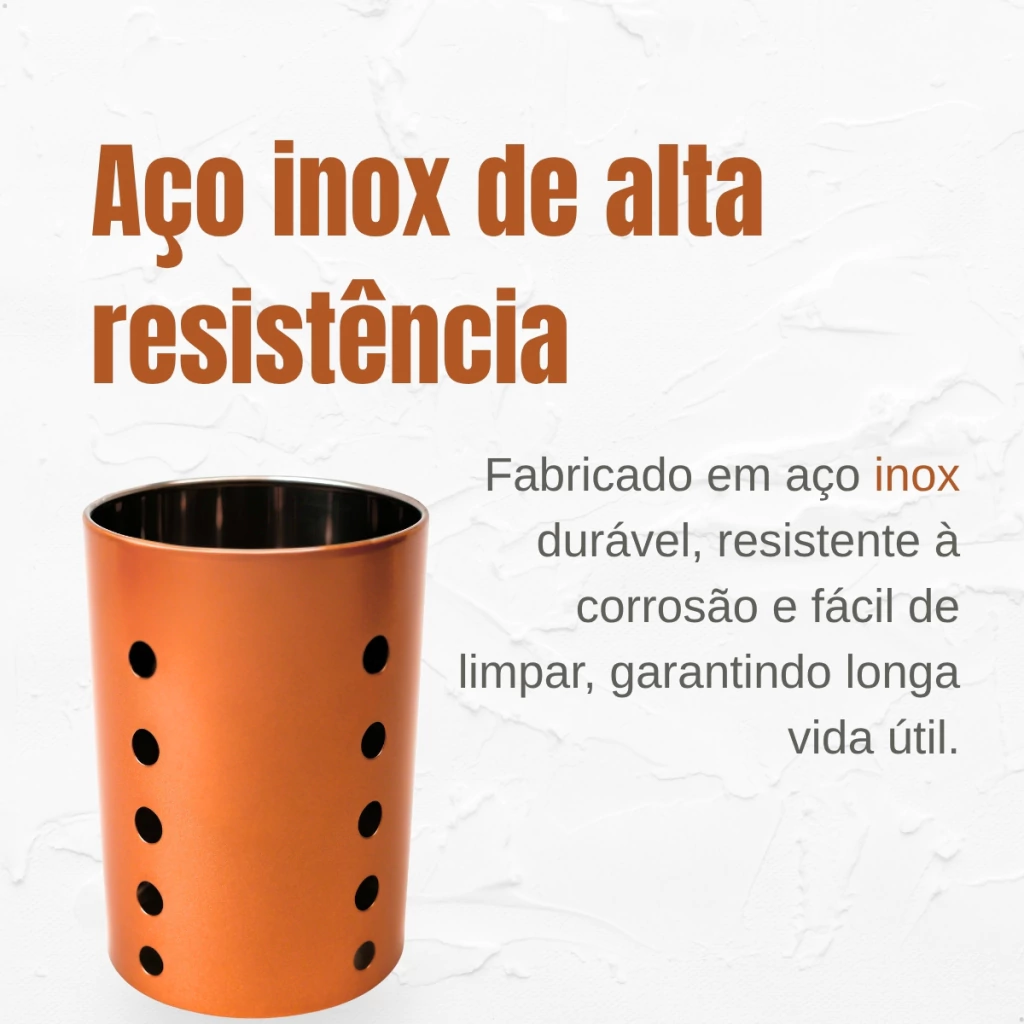 O Suporte Escorredor de Talheres em Aço Inox Bronze é a escolha ideal para quem busca funcionalidade com um toque de sofisticação. Seu acabamento bronze confere elegância e modernidade à cozinha, enquanto os furos laterais e na base permitem o escoamento da água, evitando o acúmulo de umidade. Resistente, prático e fácil de limpar, é perfeito para o uso diário.