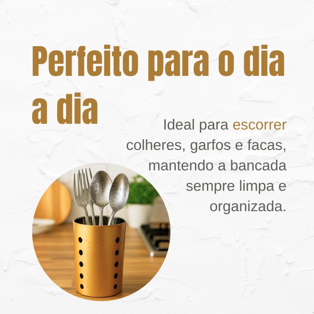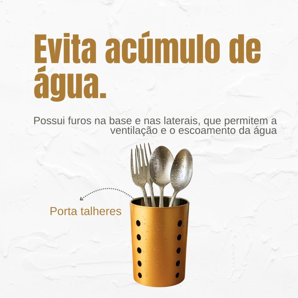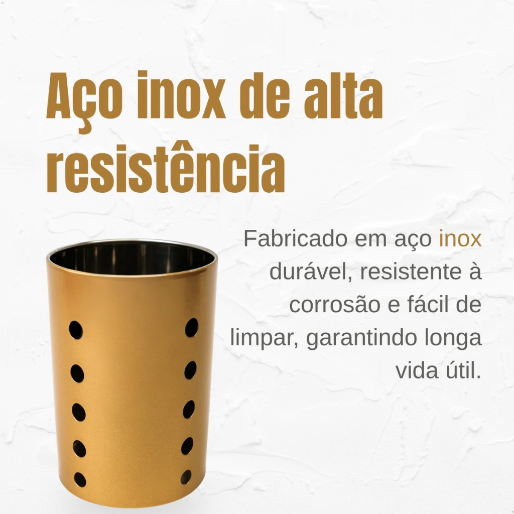 O Suporte Escorredor de Talheres em Aço Inox Dourado é ideal para quem busca praticidade e sofisticação na cozinha. Seu acabamento dourado moderno adiciona um toque de elegância, enquanto os furos nas laterais e na base evitam o acúmulo de água, mantendo os talheres secos e higiênicos. Perfeito para uso diário, combina resistência, funcionalidade e beleza.