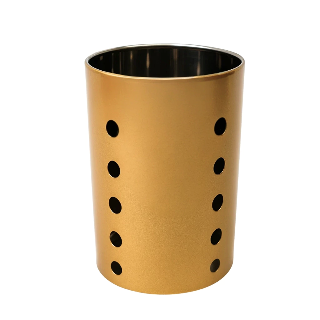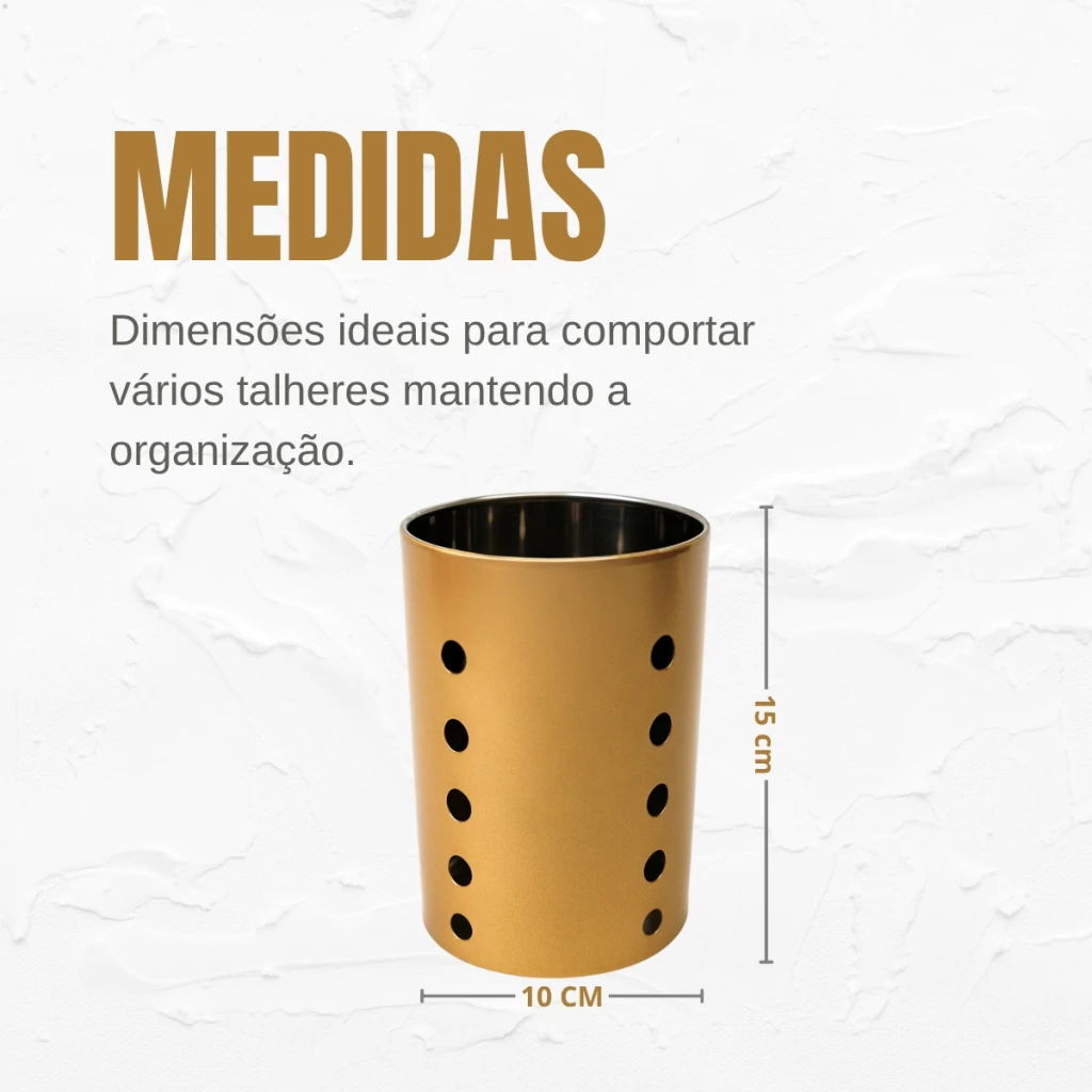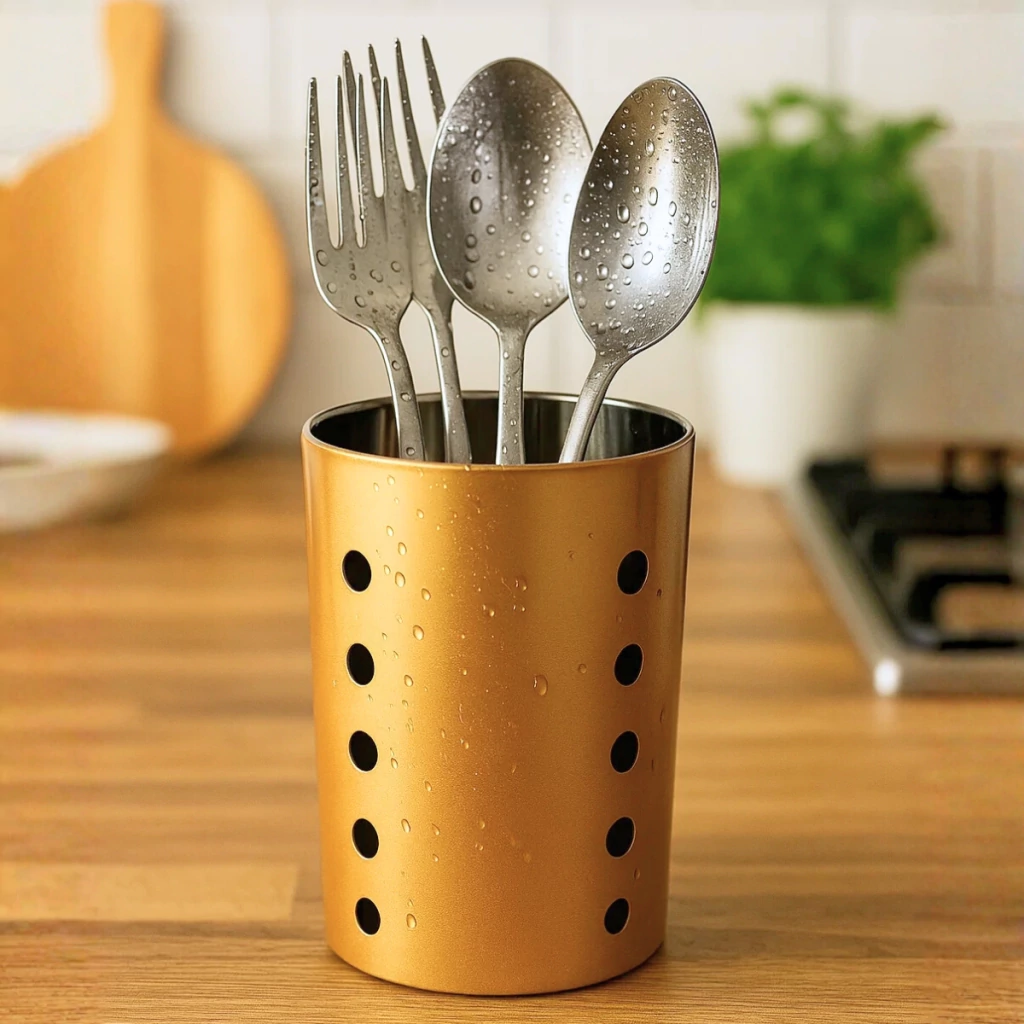 O Suporte Escorredor de Talheres em Aço Inox Dourado é ideal para quem busca praticidade e sofisticação na cozinha. Seu acabamento dourado moderno adiciona um toque de elegância, enquanto os furos nas laterais e na base evitam o acúmulo de água, mantendo os talheres secos e higiênicos. Perfeito para uso diário, combina resistência, funcionalidade e beleza.