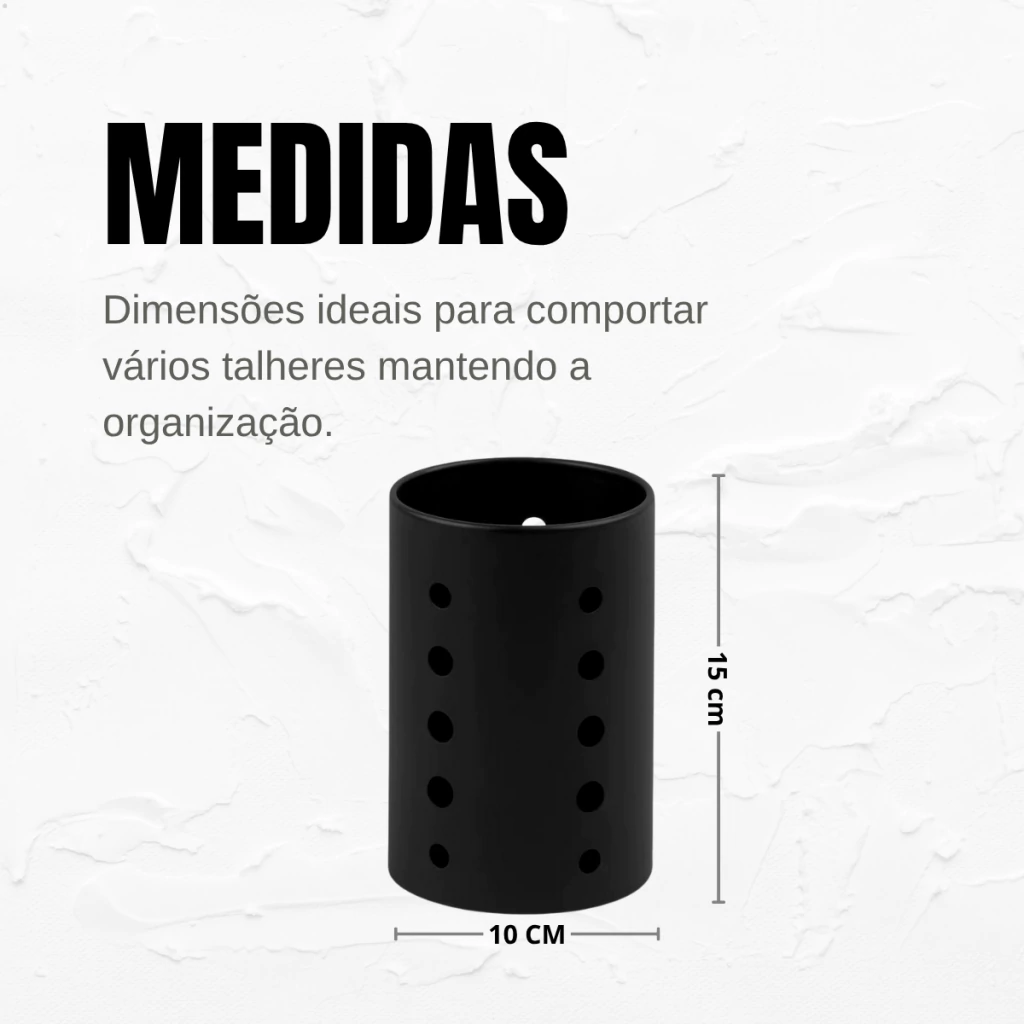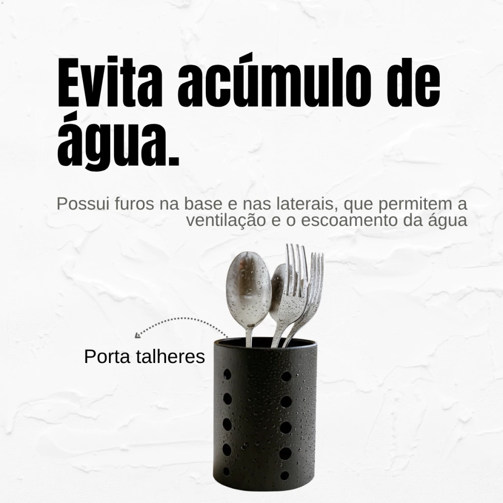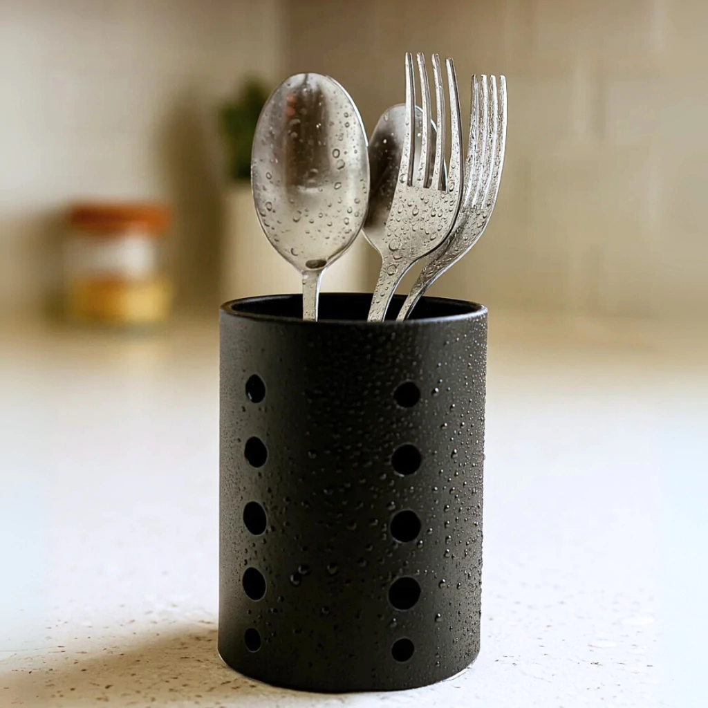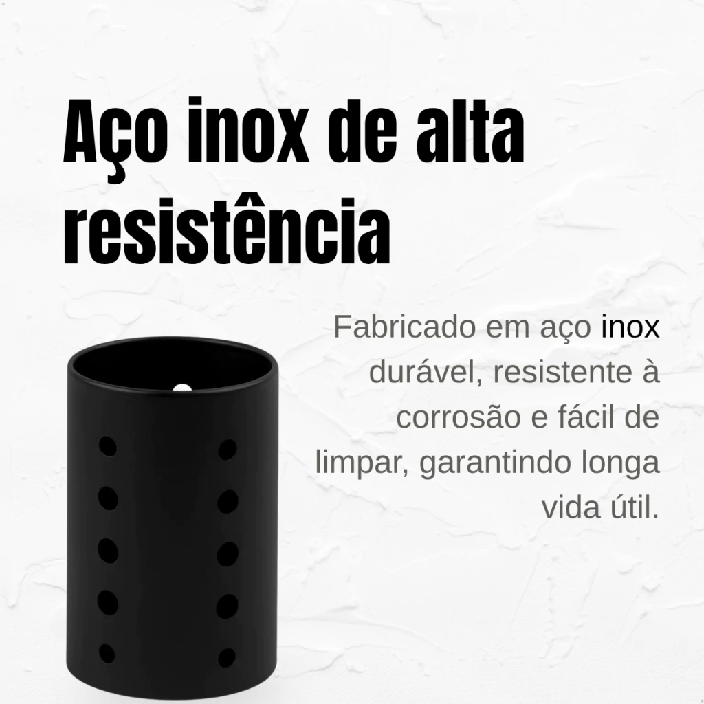 O Suporte Escorredor de Talheres em Aço Inox Preto Fosco combina praticidade e estilo moderno. Ideal para manter talheres organizados e secos, conta com furos laterais e na base que facilitam o escoamento da água, evitando acúmulo de umidade. Seu acabamento preto fosco traz um visual sofisticado e elegante, perfeito para cozinhas contemporâneas.