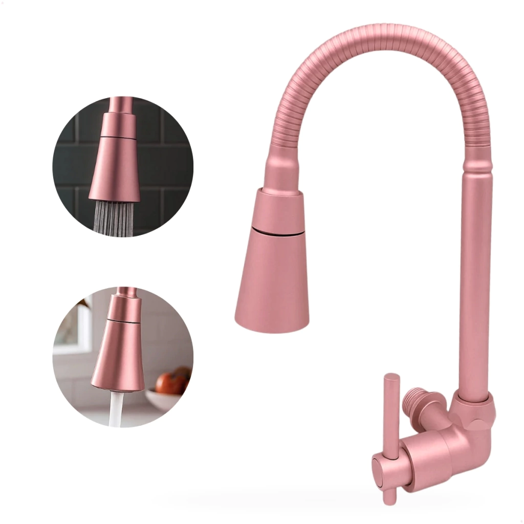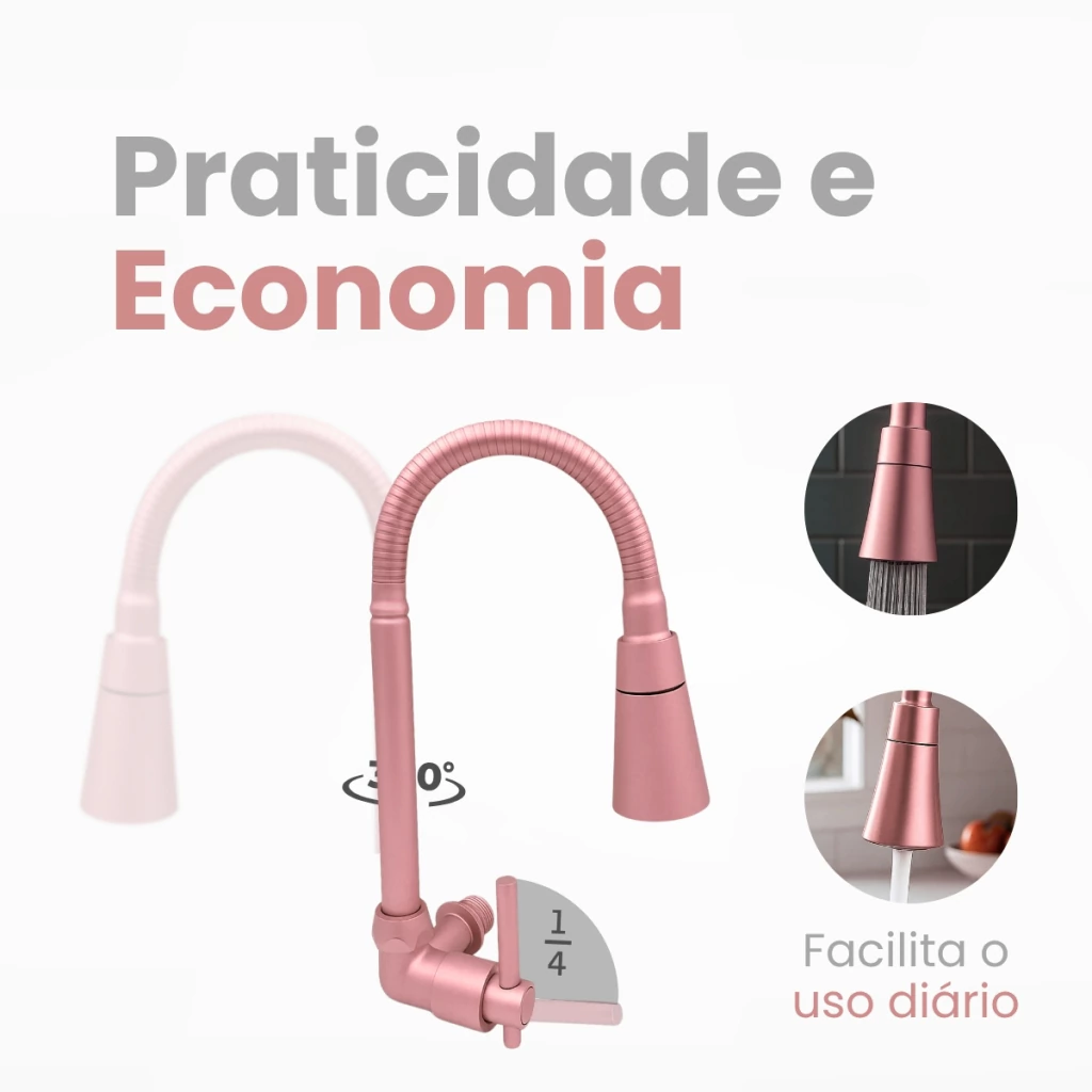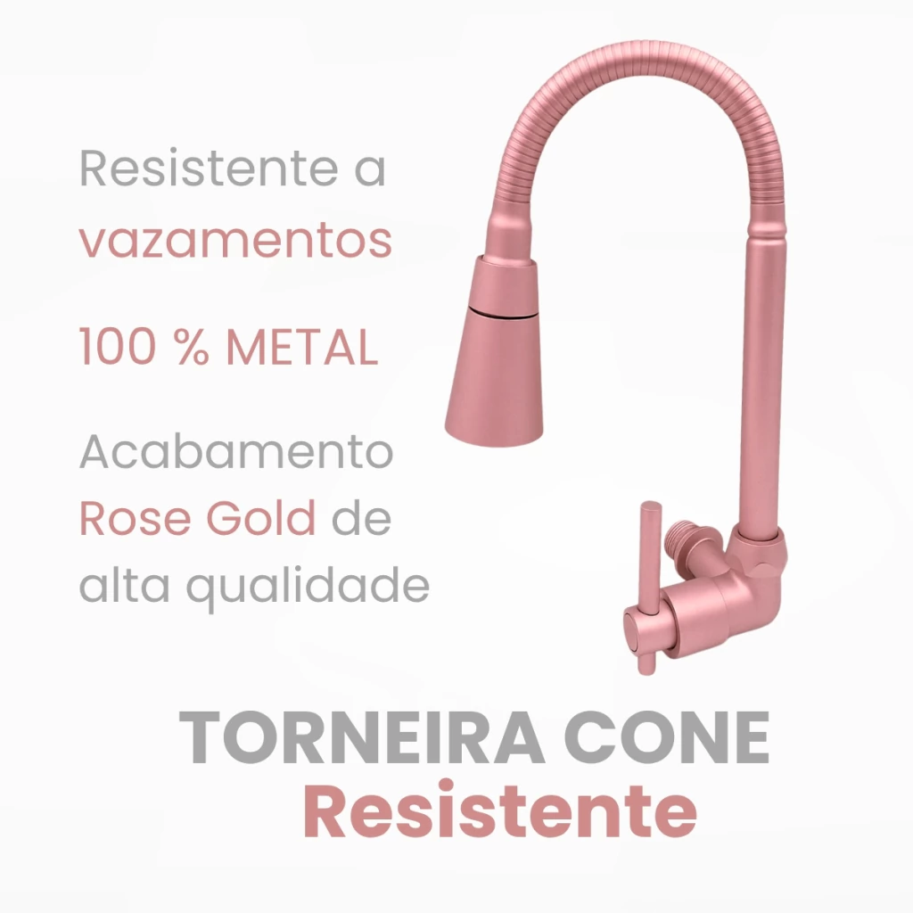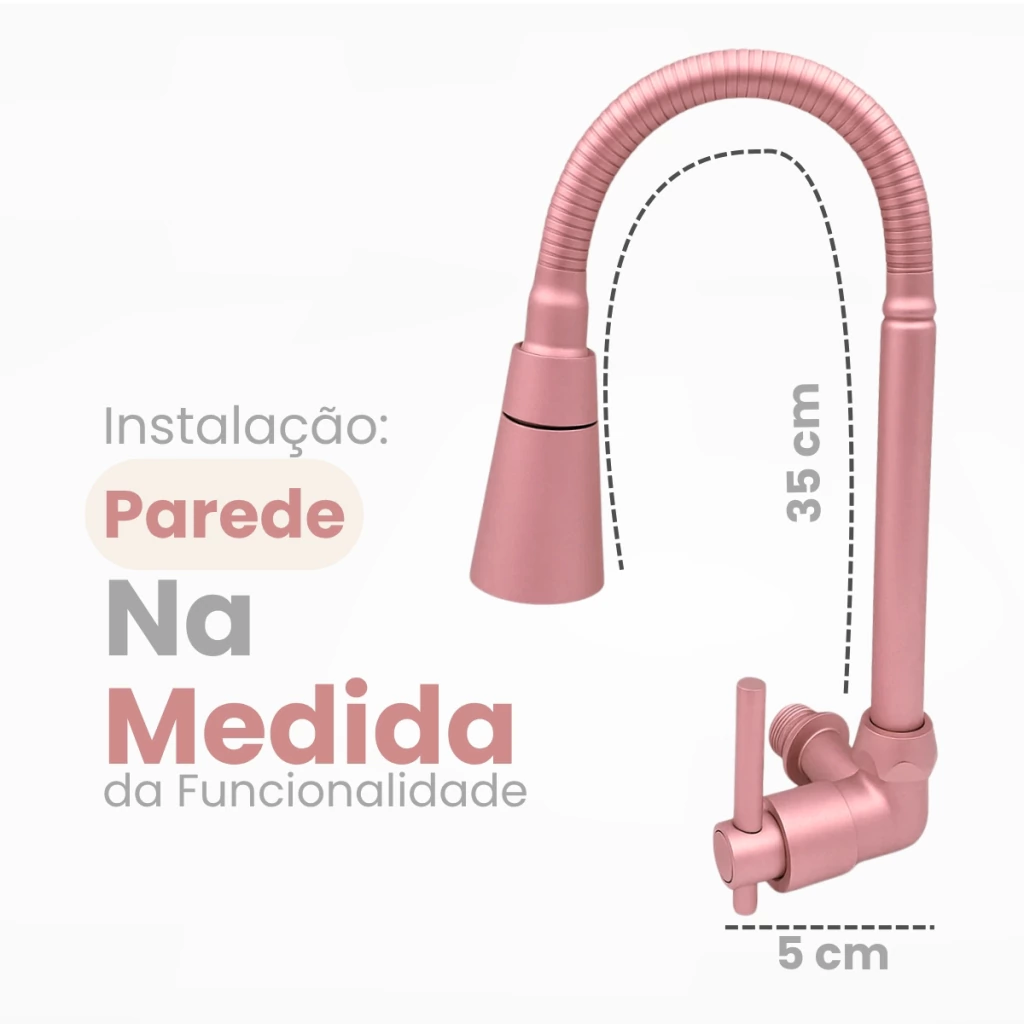- Produto: Torneira Gourmet de Parede- Instalação: Parede- Material: Metal (estrutura e base)- Acabamento: Rose gold - Arejador: Cone com 2 jatos – contínuo e chuveirinho- Tubo: Flexível com 35 cm de extensão- Base: 5 cm de largura- Acionamento: 1/4 de volta- Mecanismo: Cartucho cerâmico- Giro do tubo: 360º- Indicação: Cozinhas residenciais ou comerciais