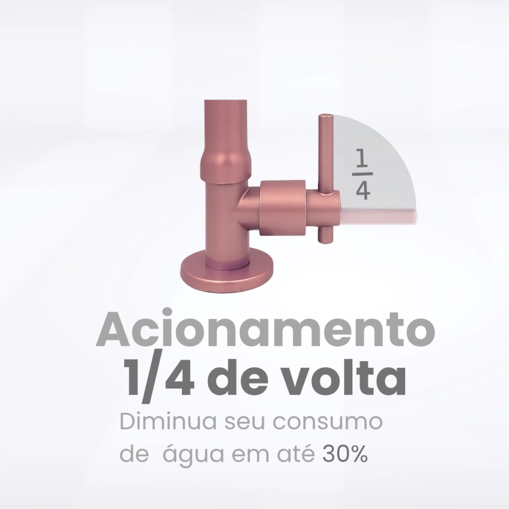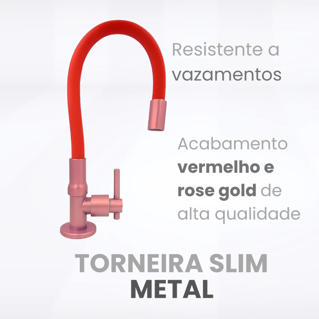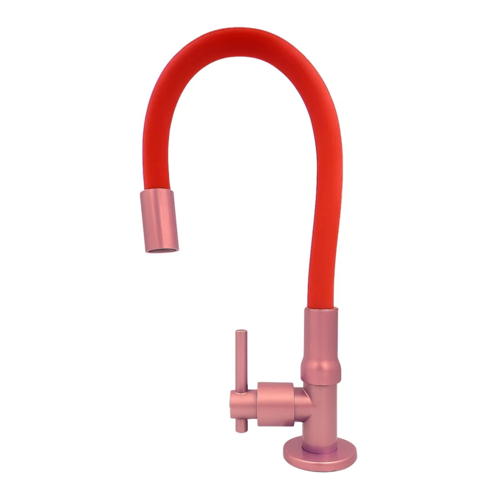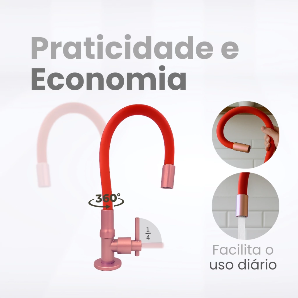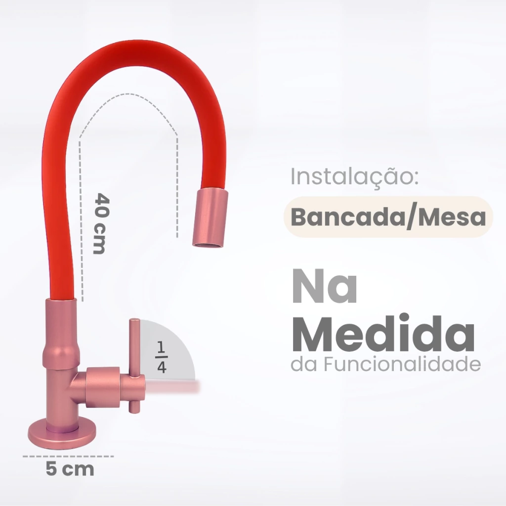 A Torneira Slim Vermelha e Rose Gold de Bancada combina elegância e funcionalidade para deixar sua cozinha ainda mais charmosa. Seu tubo flexível 360º oferece liberdade total de movimento, facilitando o uso no dia a dia. A base metálica com acabamento rose gold acetinado garante durabilidade e resistência à corrosão, enquanto o acionamento 1/4 de volta proporciona controle preciso da vazão e economia de água. Ideal para quem busca estilo e eficiência em um único produto.