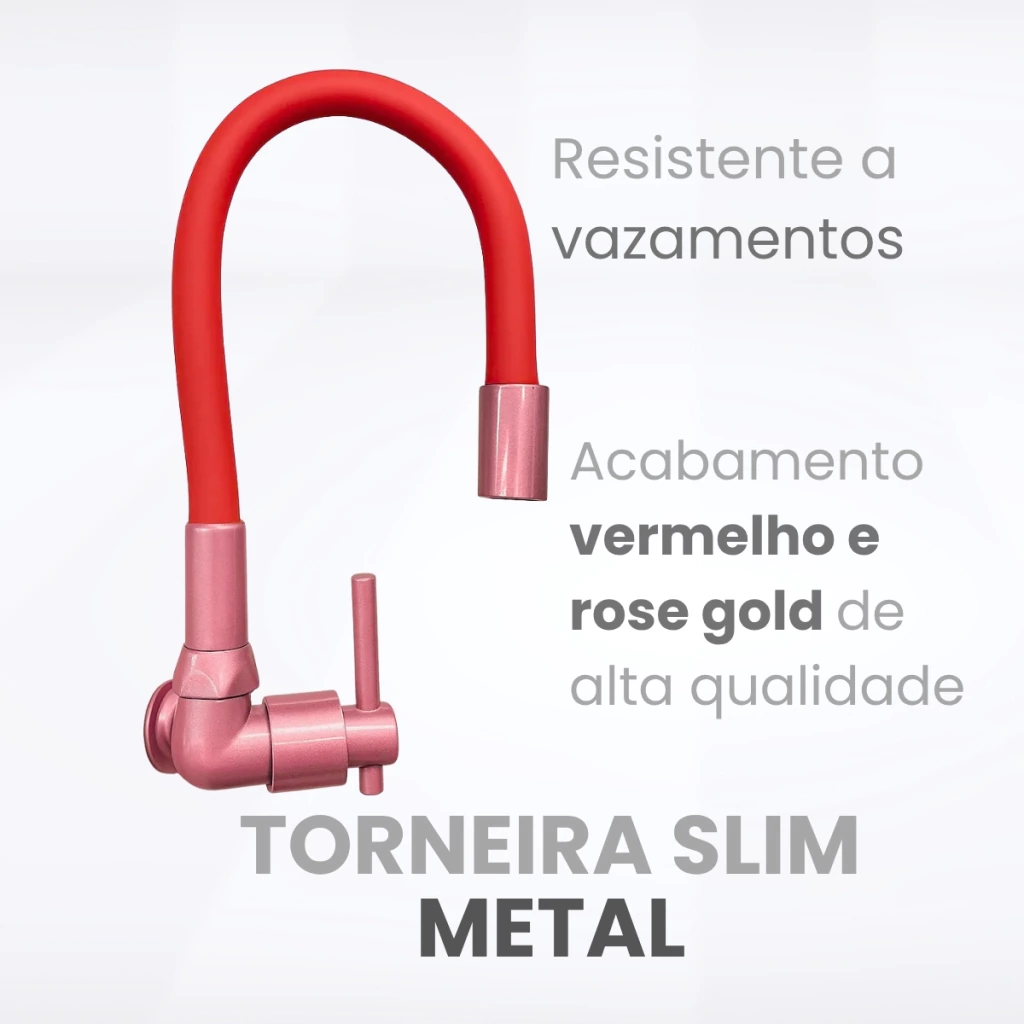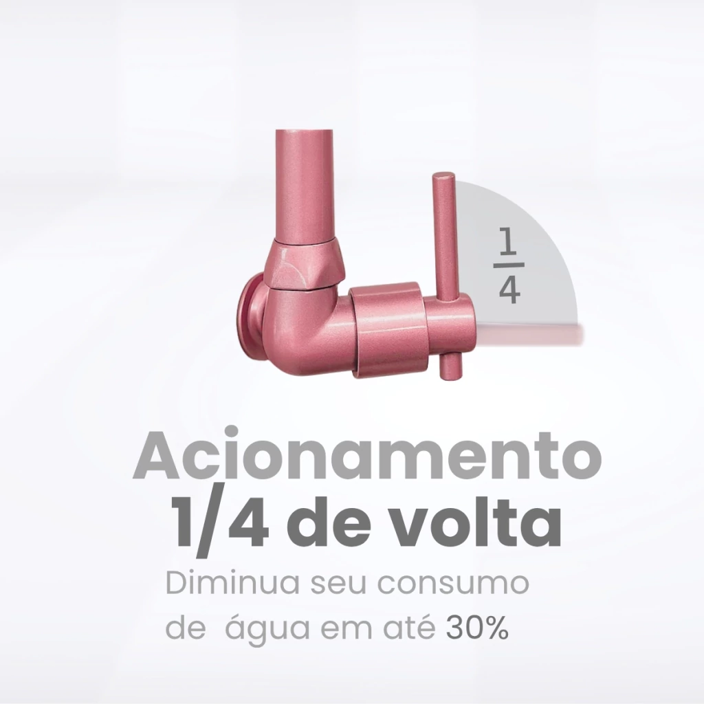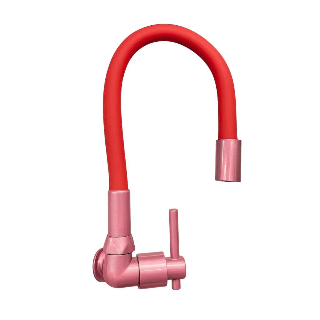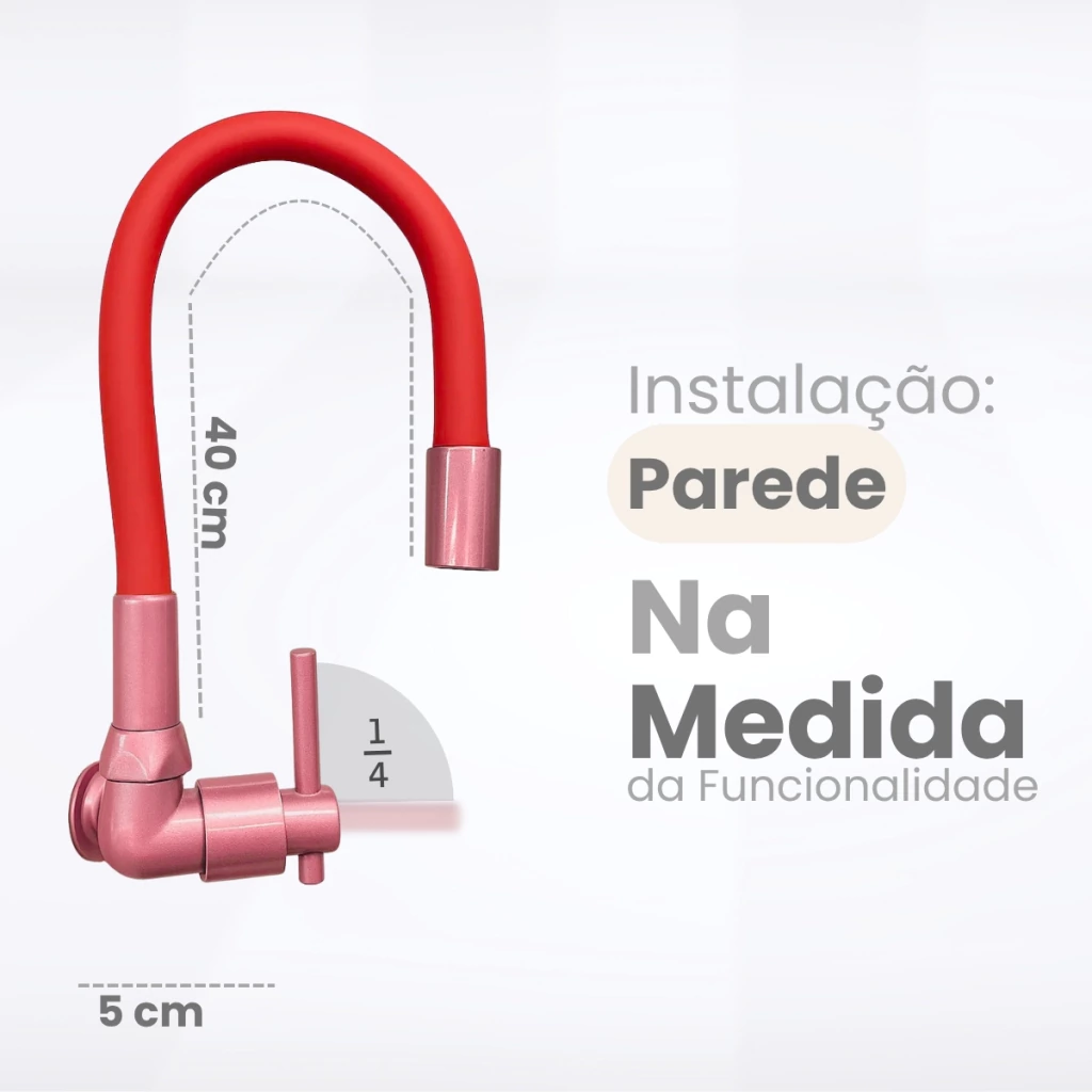 A Torneira de Parede Slim Vermelha é a escolha ideal para quem busca um toque moderno e sofisticado na cozinha. Seu tubo flexível 360º permite total mobilidade e praticidade no uso diário. A base metálica rose gold acetinado garante resistência, durabilidade e um visual elegante. Com acionamento 1/4 de volta, oferece conforto e precisão no controle da vazão da água, unindo eficiência e design em um só produto.