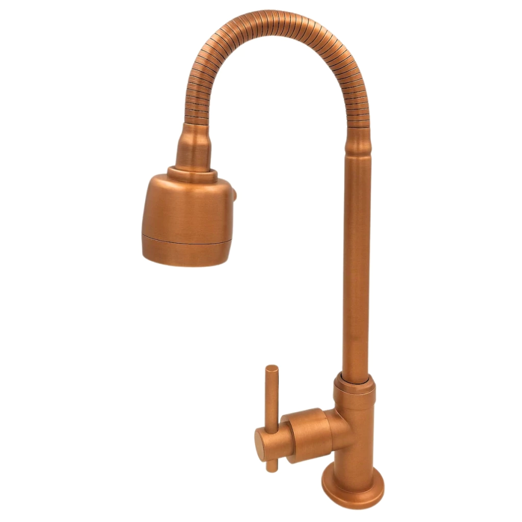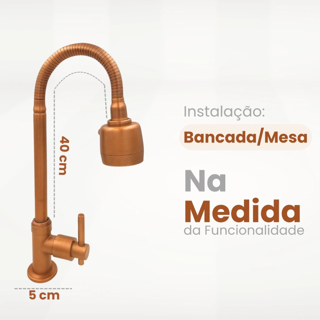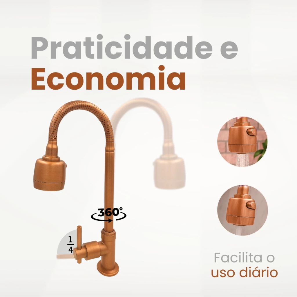 A Torneira Gourmet de Bancada na cor bronze une funcionalidade, estilo e resistência. Seu tubo flexível com extensão de até 35 cm e giro 360° facilita o uso diário, ideal para tarefas em cubas duplas.