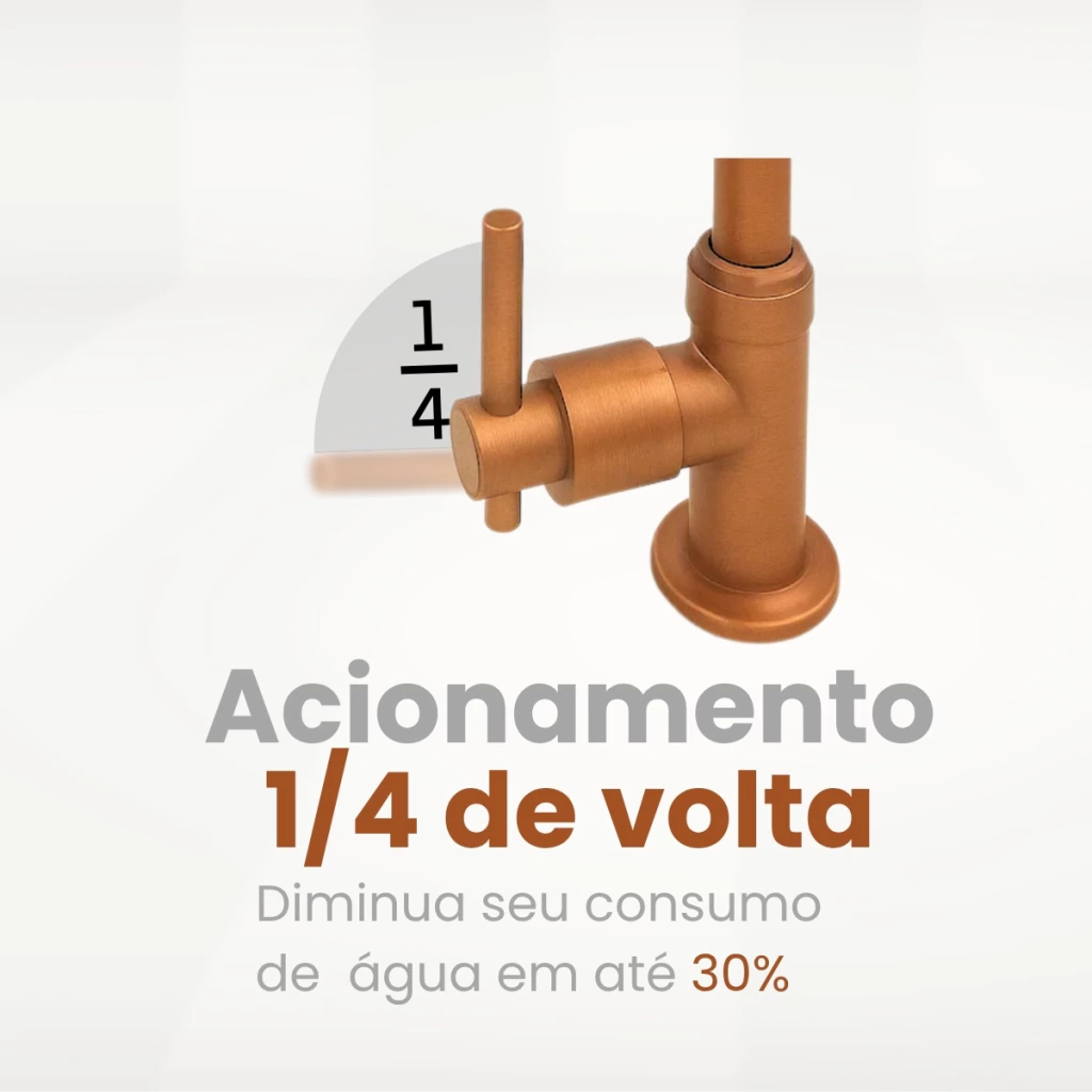 Feita em metal com acabamento bronze fosco (não brilhante), é durável e resistente à corrosão. Conta com acionamento 1/4 de volta, que proporciona controle de vazão com suavidade. Uma solução prática e elegante para cozinhas modernas.