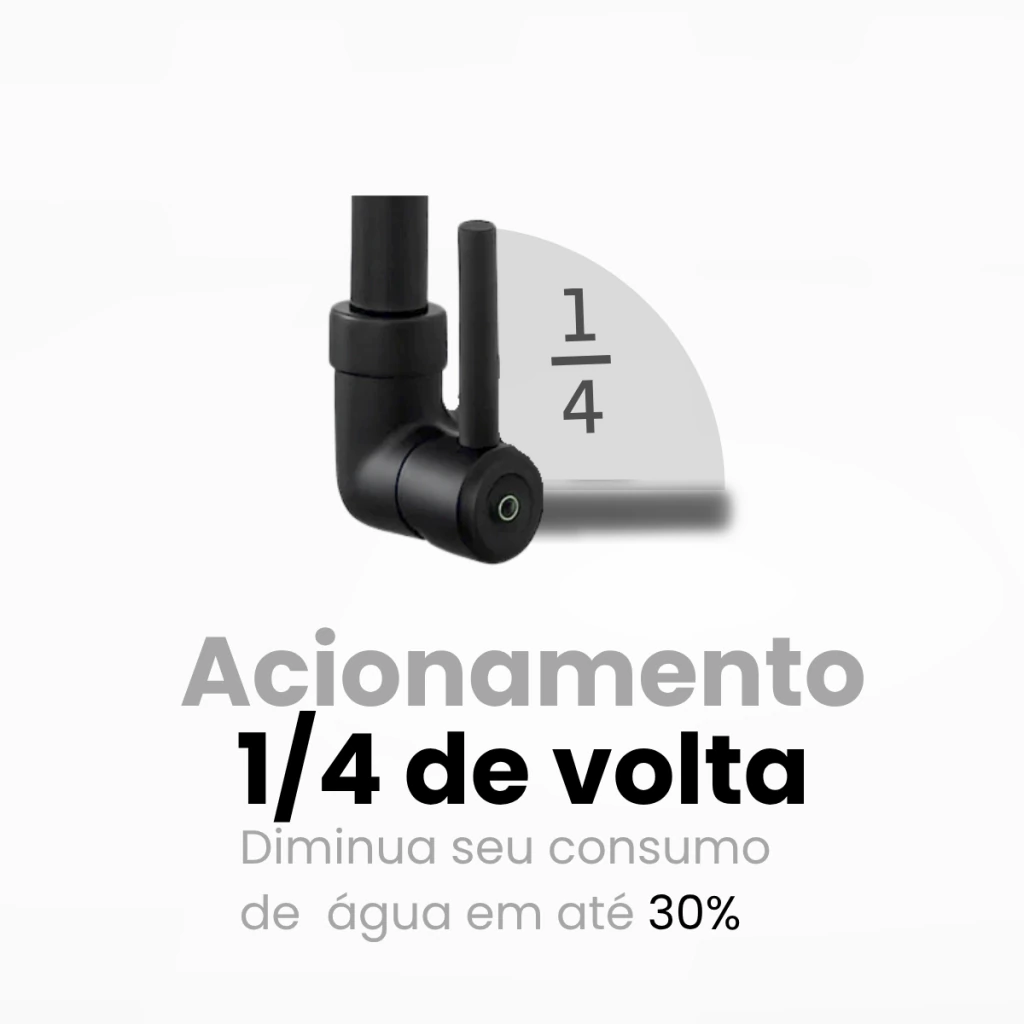 O arejador cone possui 2 jatos — contínuo e chuveirinho — ideal para lavar alimentos e louças com mais eficiência. O acionamento 1/4 de volta permite um controle preciso do fluxo, unindo economia e conforto.