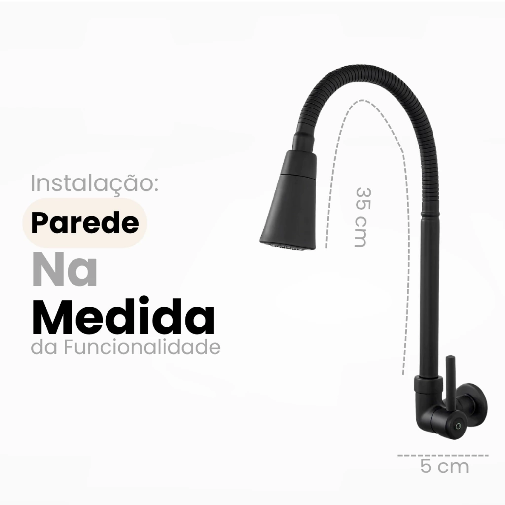 Com instalação na parede, essa torneira traz um acabamento preto fosco sofisticado, perfeito para cozinhas modernas e funcionais.