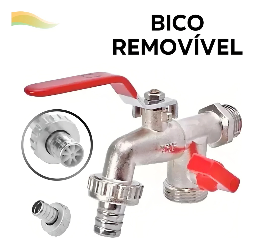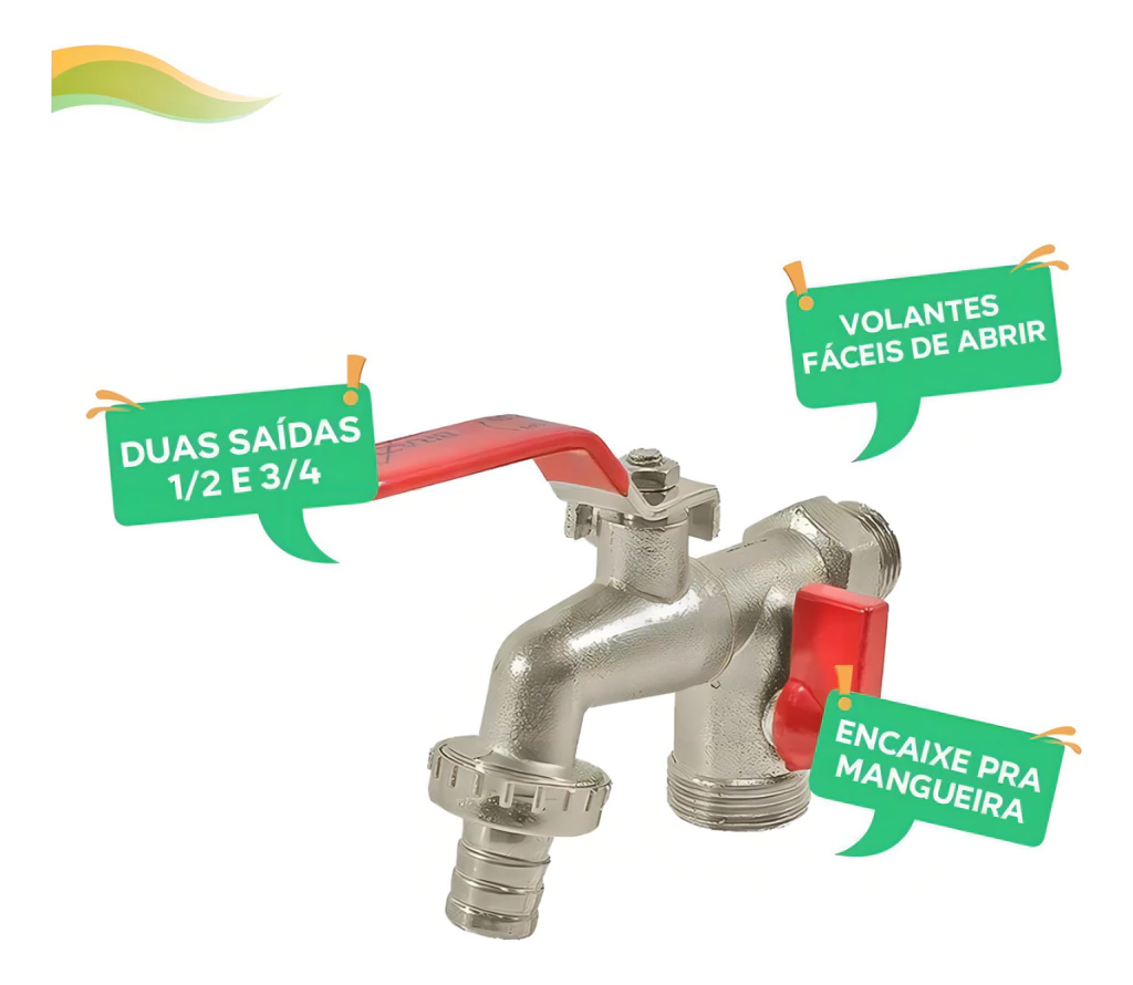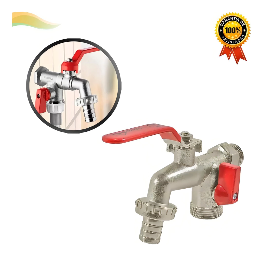 Torneira Esfera Duas Saídas 1/2” e 3/4” – Metal Resistente para Lavanderia, Jardim e Mangueira